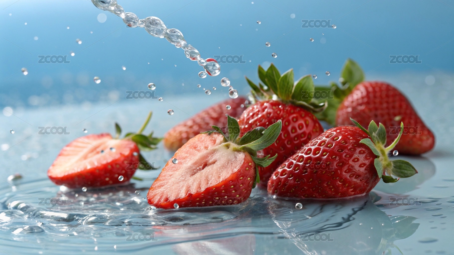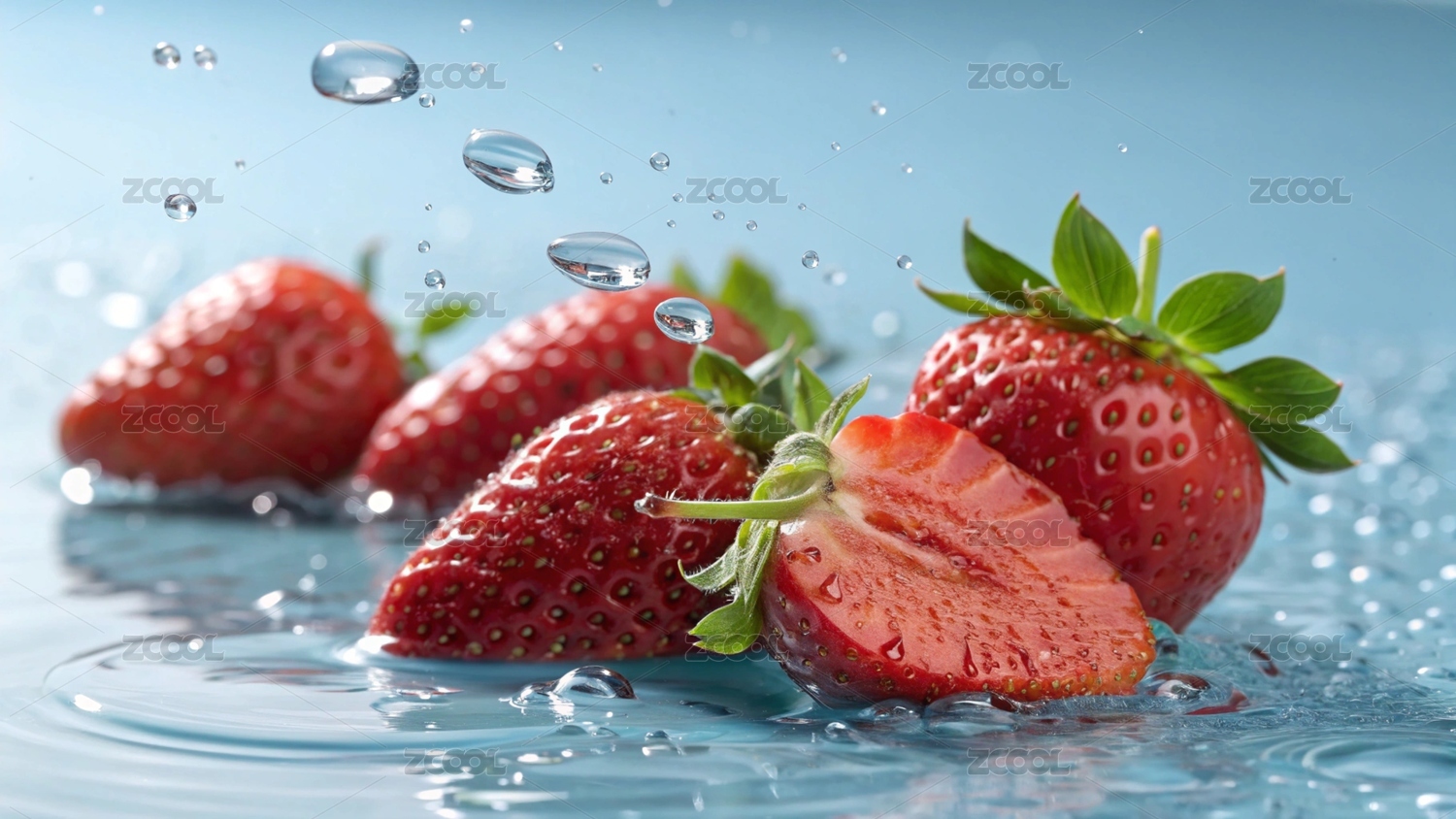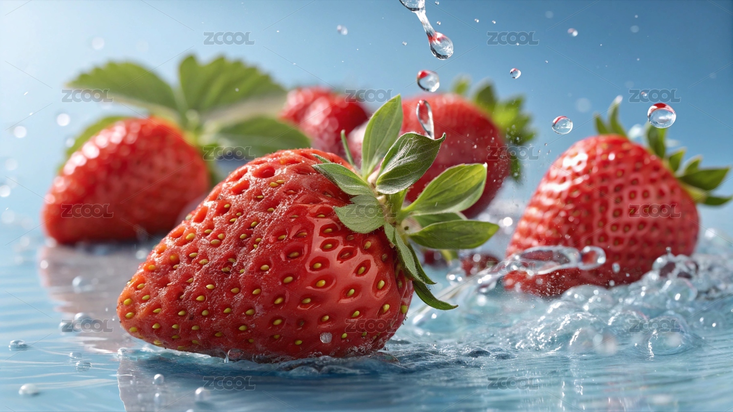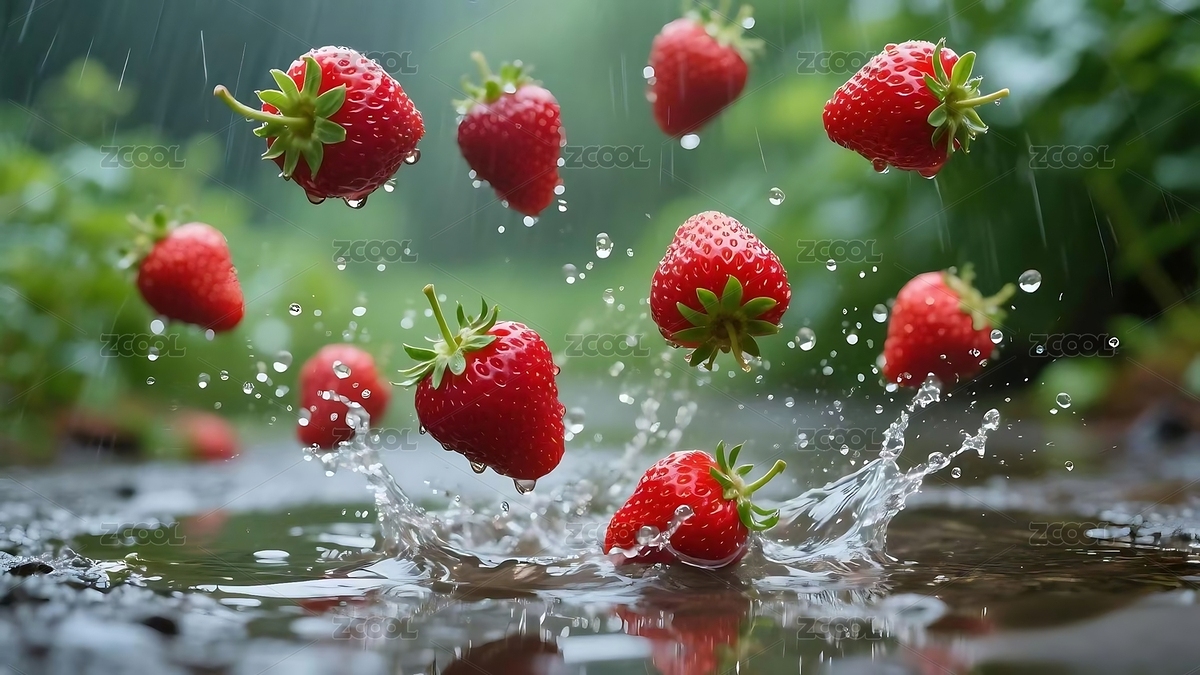 草莓,雨中,水珠,飞溅,鲜红,果蒂,翠绿,欲滴,鲜活,水润
