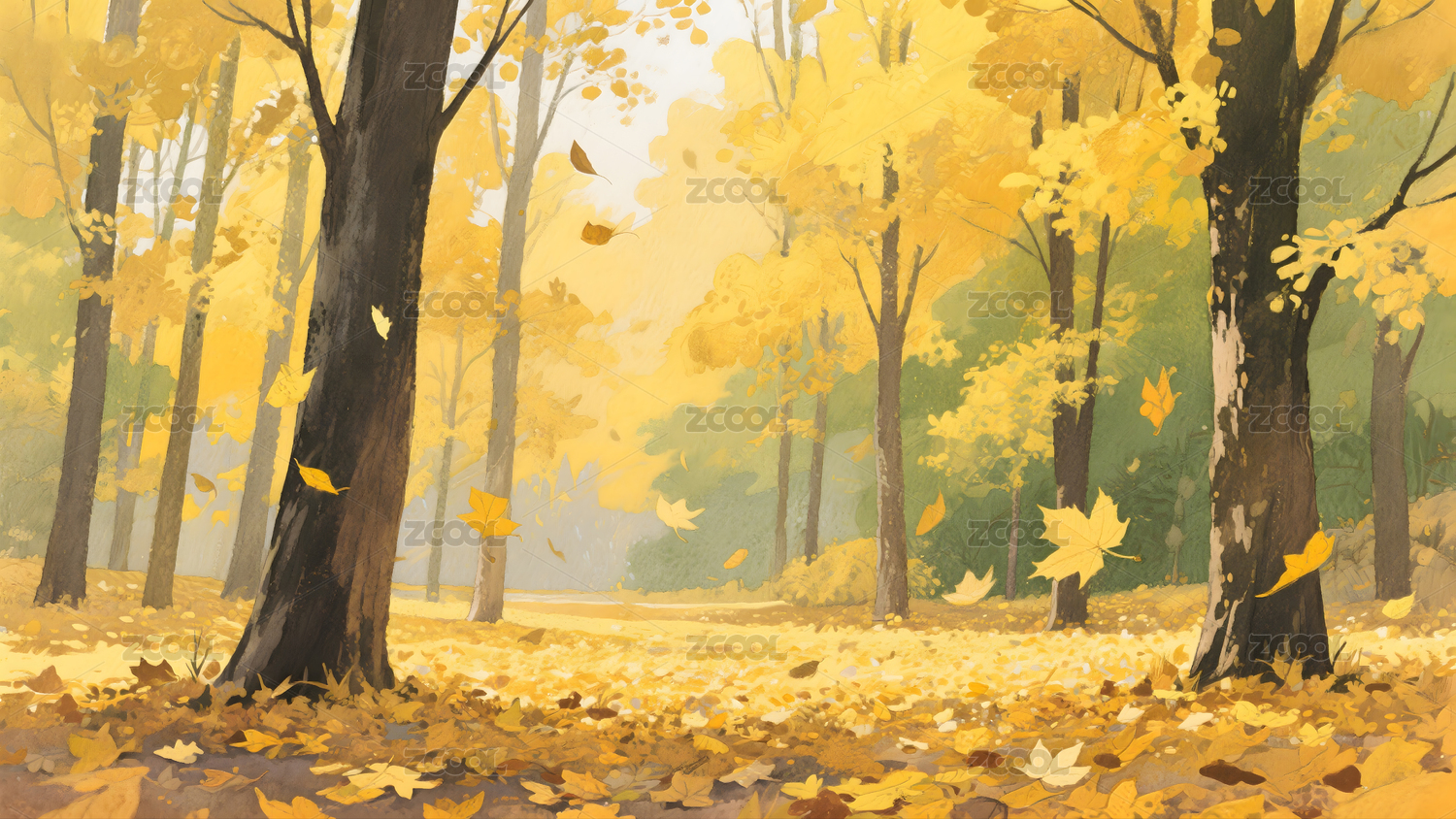 大树,蝴蝶,落叶,秋天,风景,插画,唯美,自然,树叶,光影