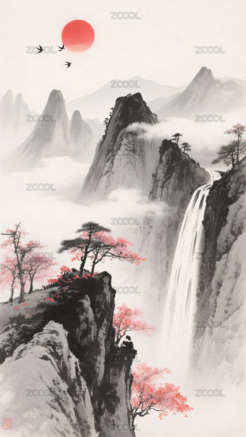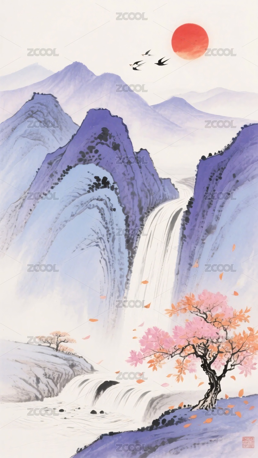 山水,落日,瀑布,飞鸟,繁花,插画,自然,风景,画面元素,主题