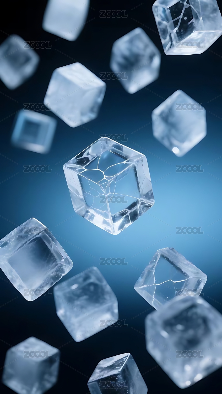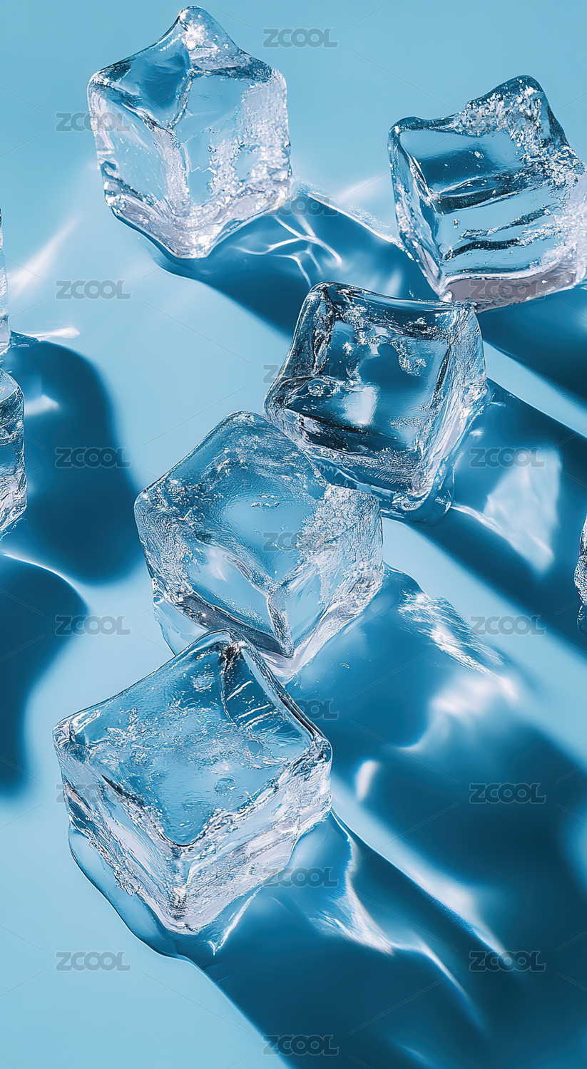 摄影,微观,冰块,立方,透明,质感,冷冽,光影,蓝调,背景