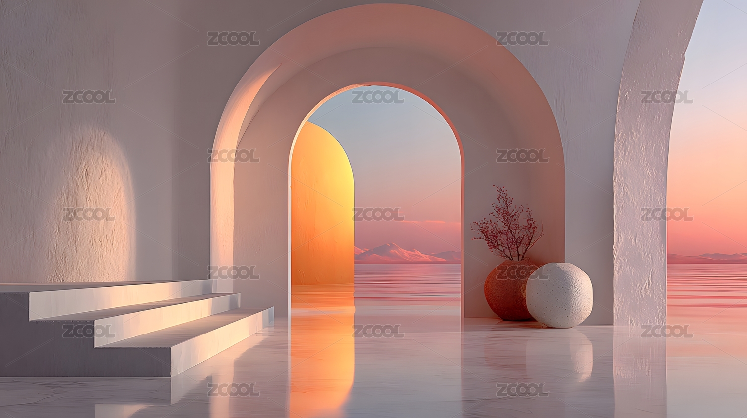 极简拱门与夕阳海景