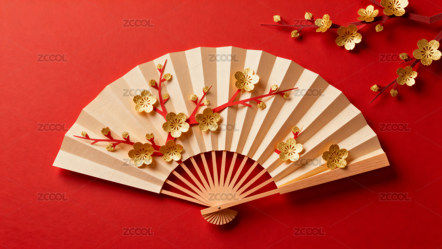 金色梅花折扇红色背景