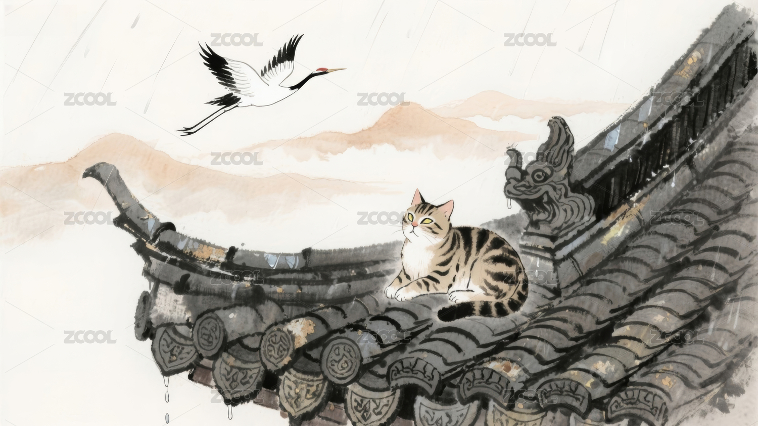 古建筑,屋顶,树荫,猫咪,水彩,水墨,国画,艺术,背景