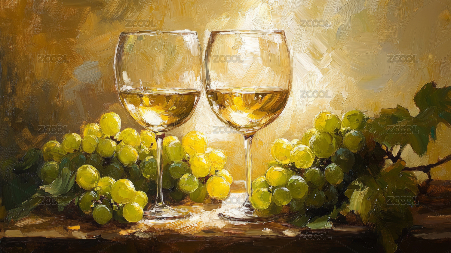 玻璃杯中的白葡萄酒和散落的绿色葡萄