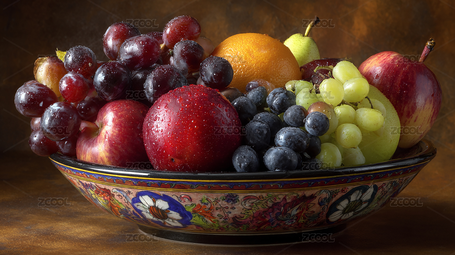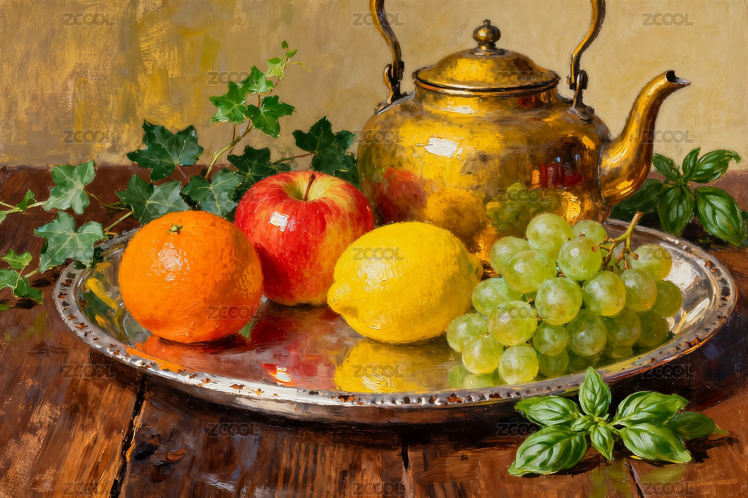 室内,果盘,葡萄,桃子,青提,李子,银盘,厚涂,油画,艺术