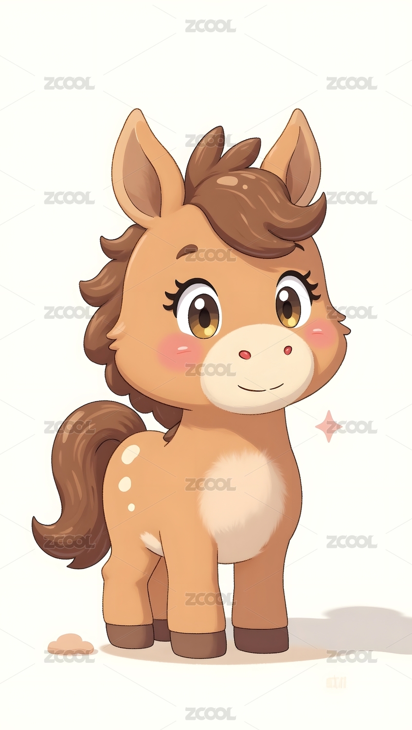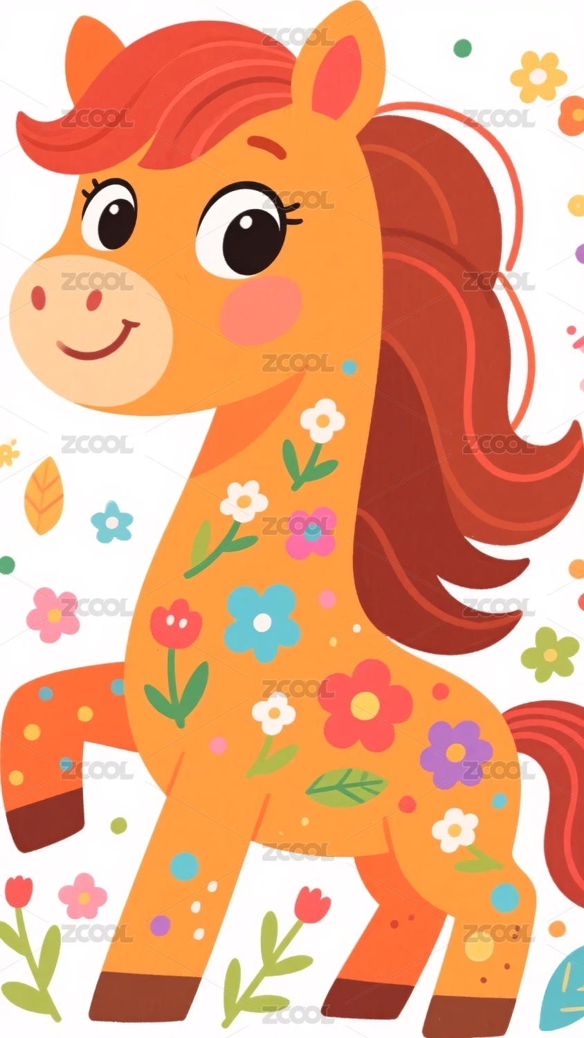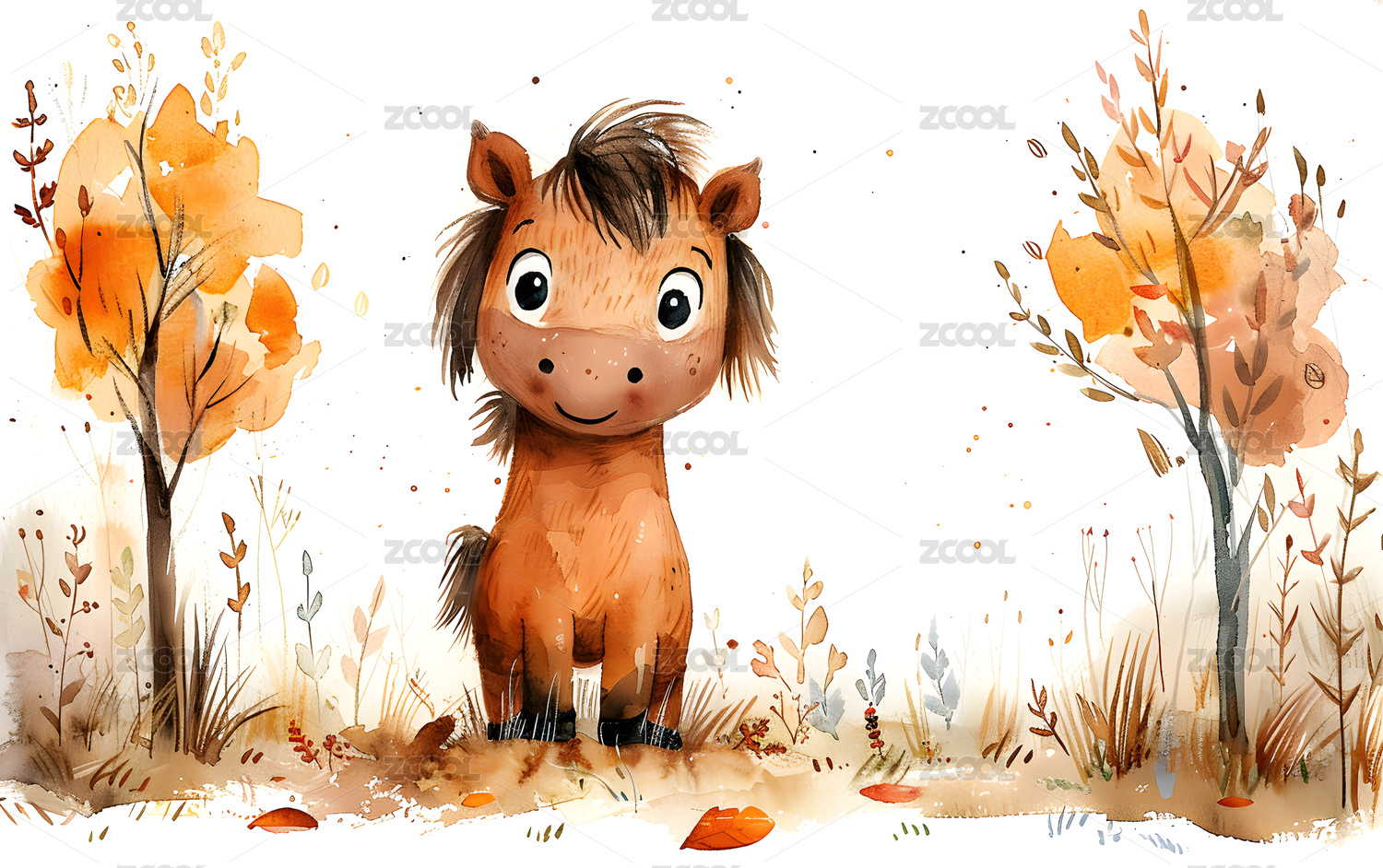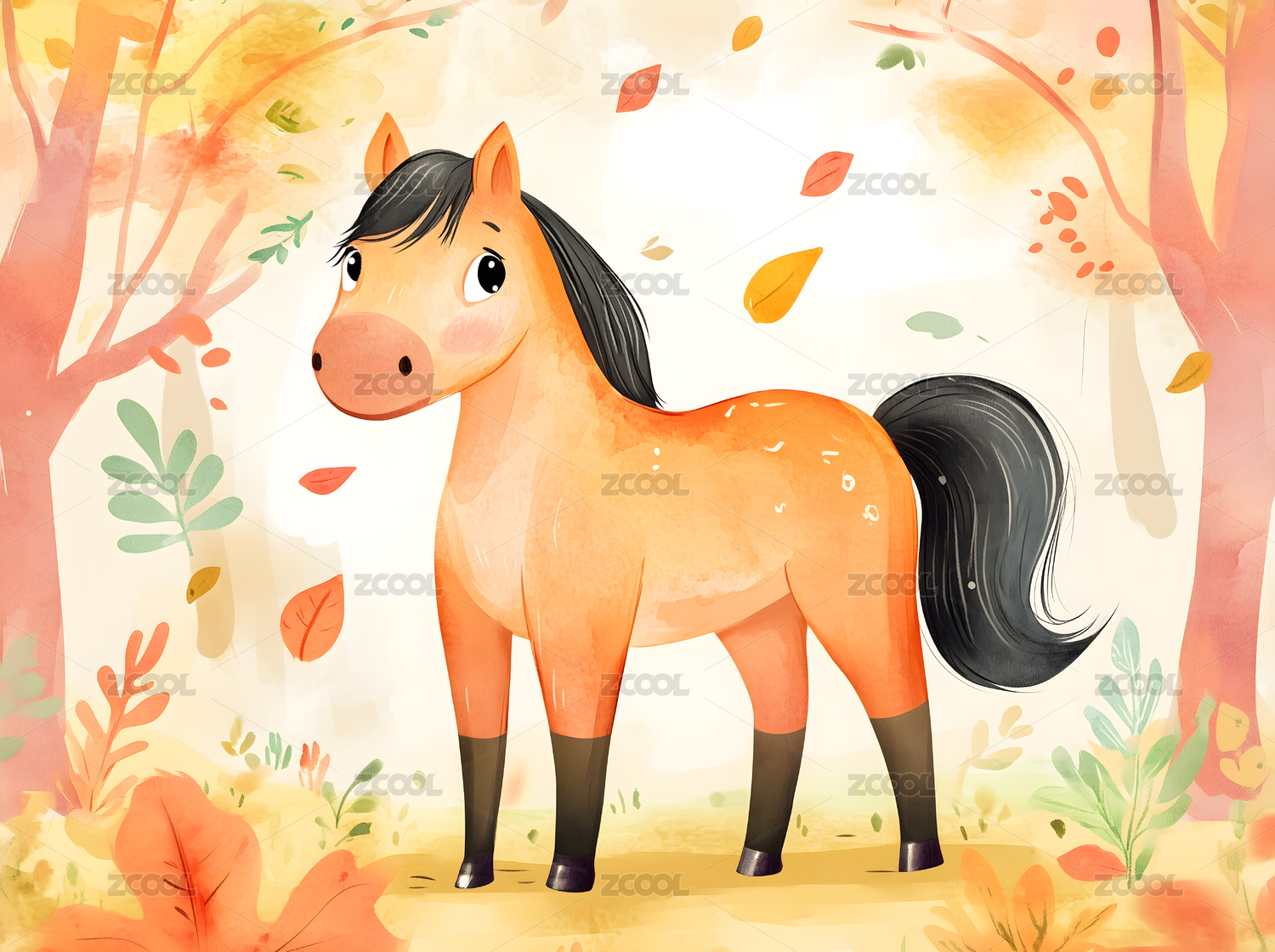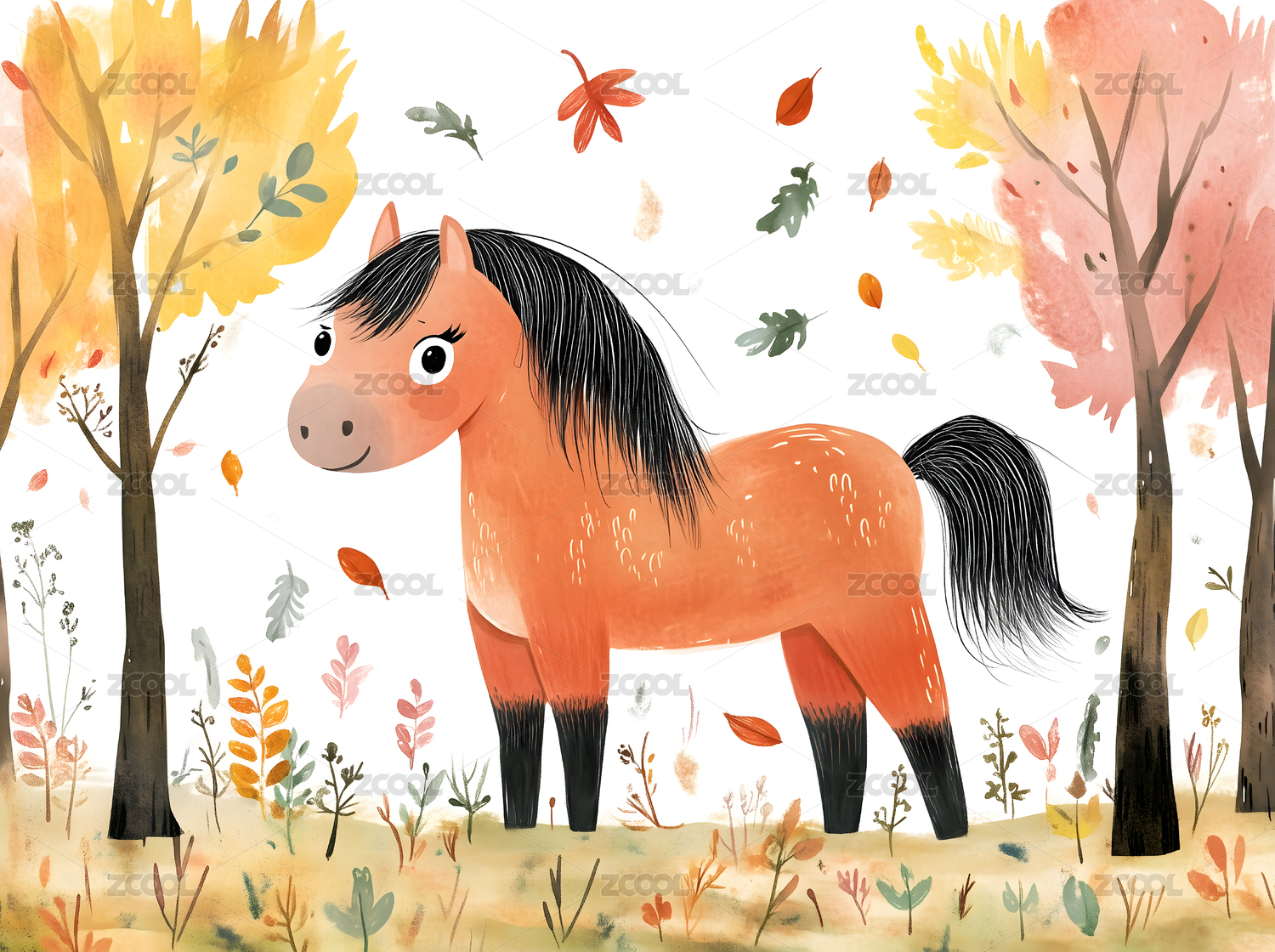 小马,插画,动物,草地,树叶,卡通,可爱,童趣,元素,画面