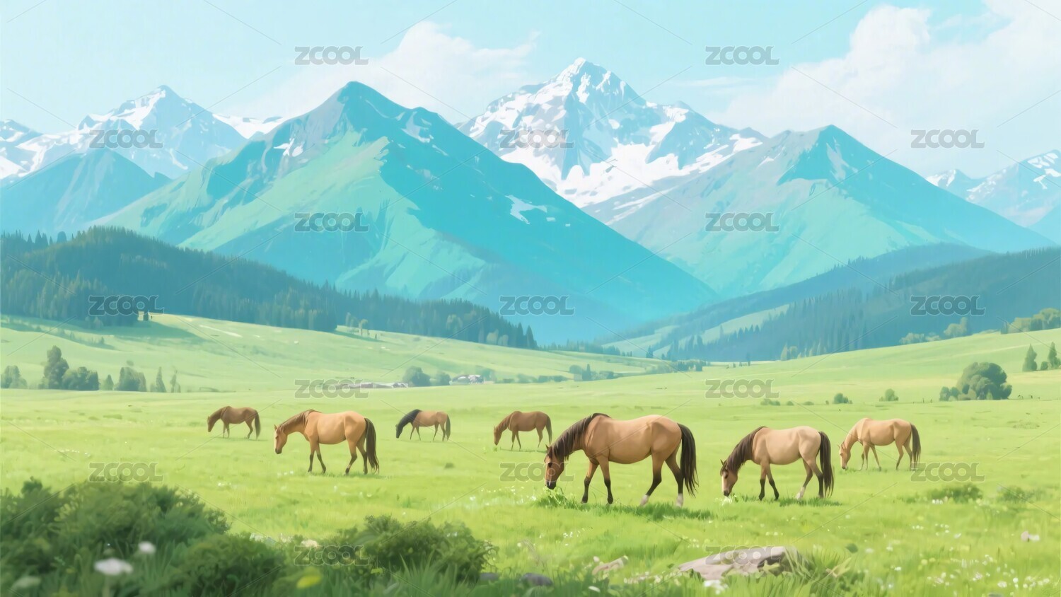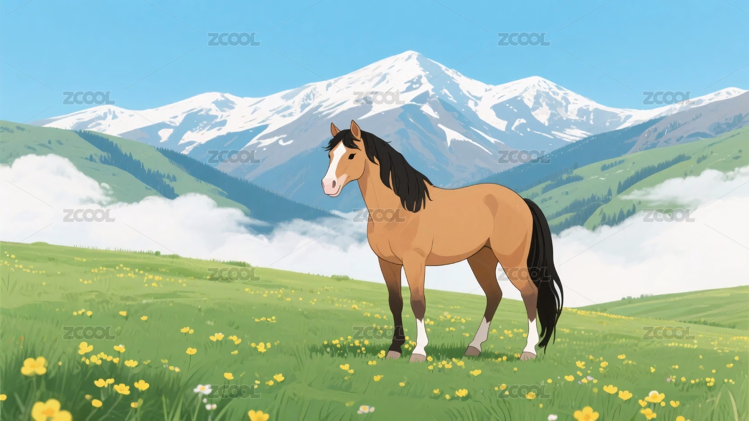 骏马,草原,雪山,蓝天,白云,花草,插画,自然,风景,动物