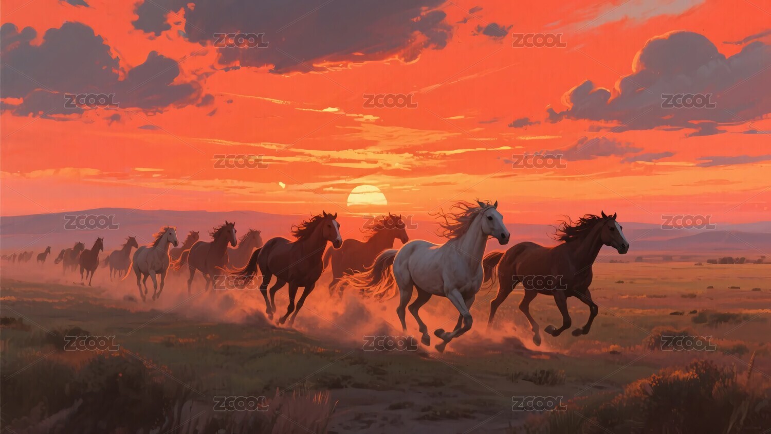 骏马,旷野,夕阳,云彩,山脉,插画,风景,自然,宁静,唯美