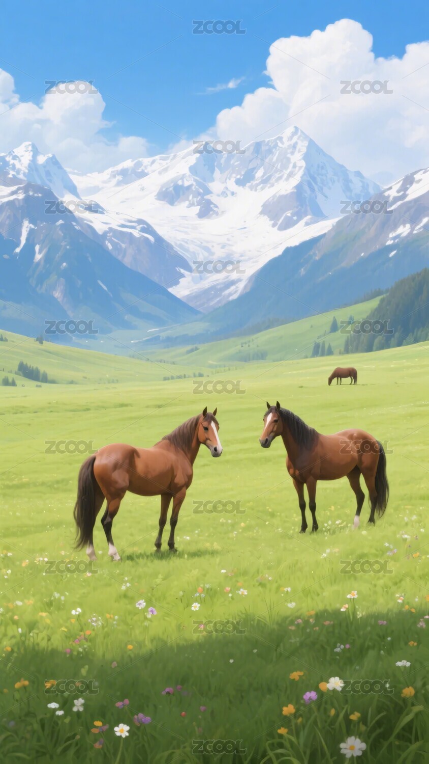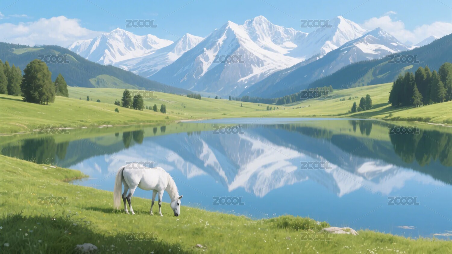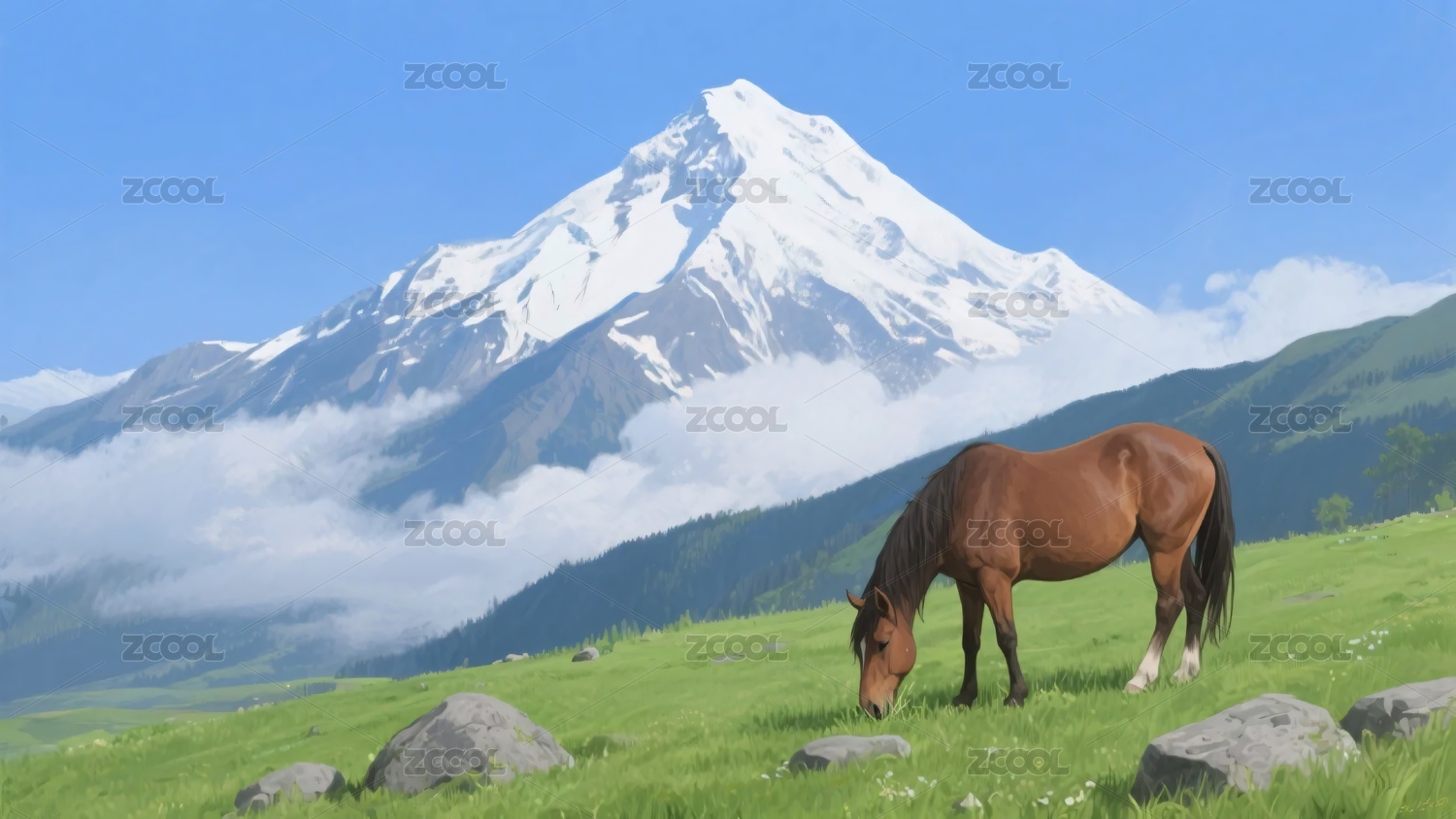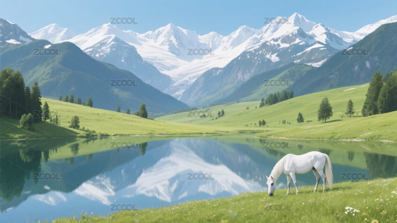 草原,雪山,树木,蓝天,白云,风景,插画,自然,户外,宁静