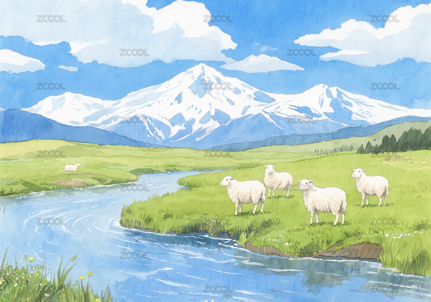 草原,雪山,树木,蓝天,白云,风景,插画,自然,户外,动物