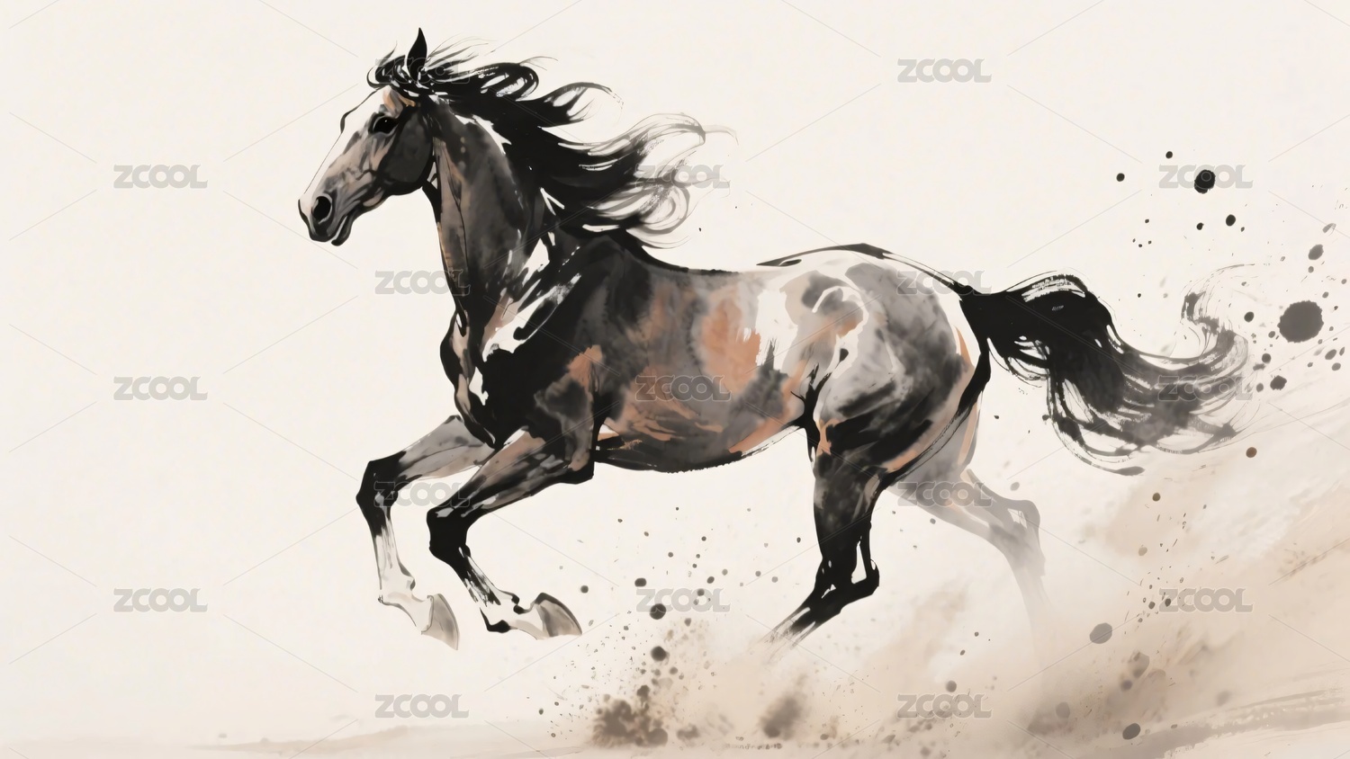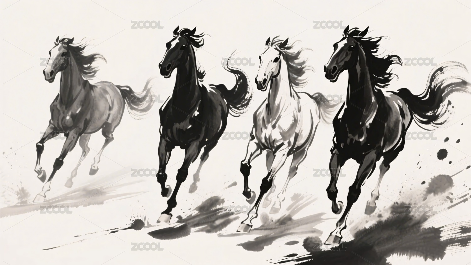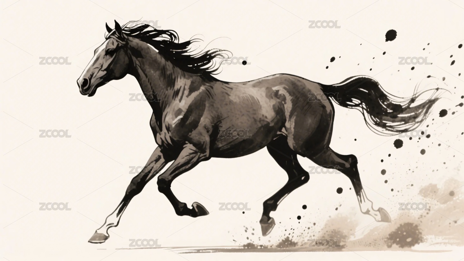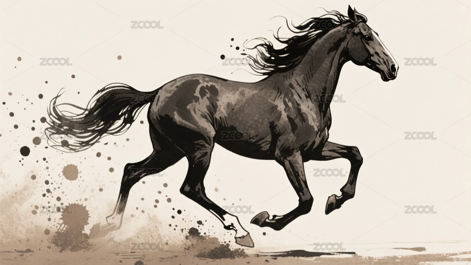 骏马,奔跑,水墨,插画,艺术,画面元素,动态,黑白,写意,水墨风