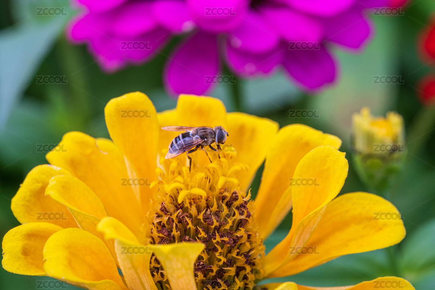 紫红色百日菊上的蜂蝇