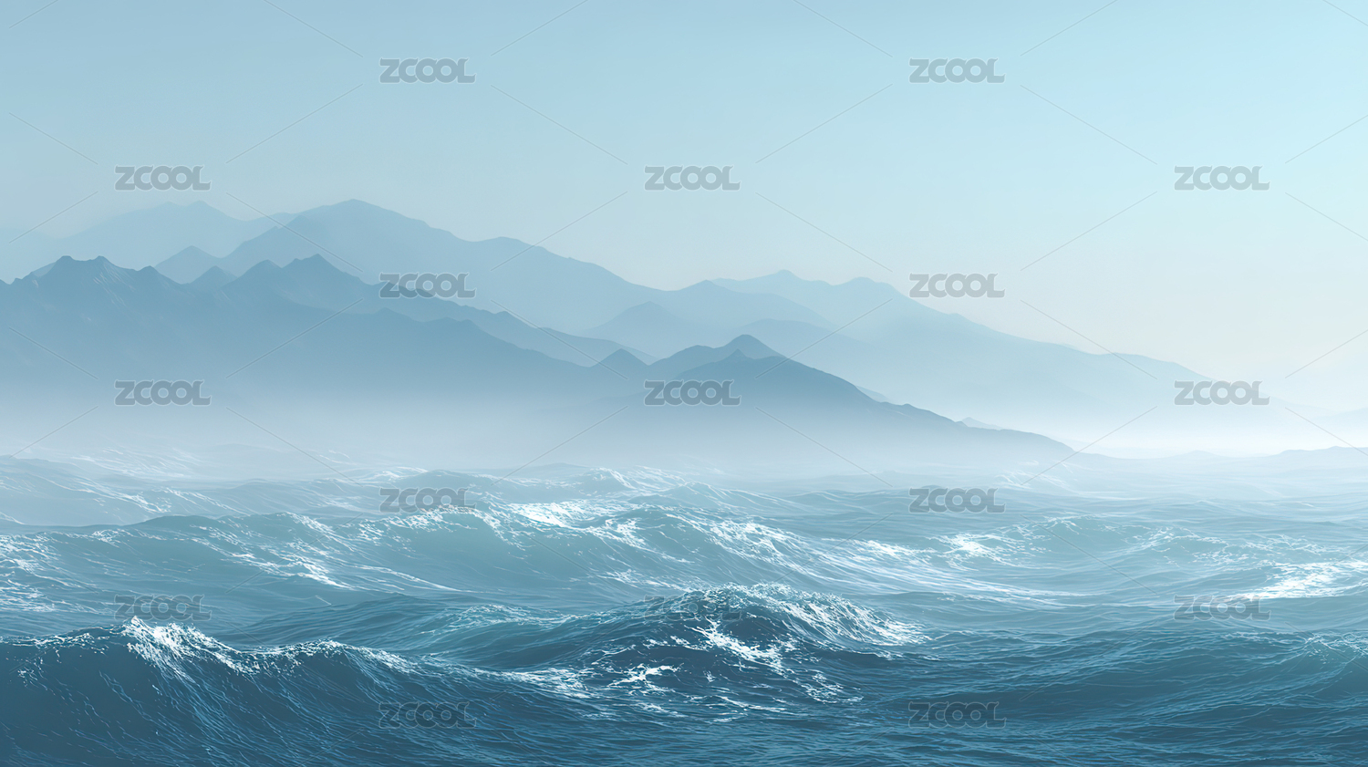 粉色天空下波涛汹涌的海面与巍峨山峰