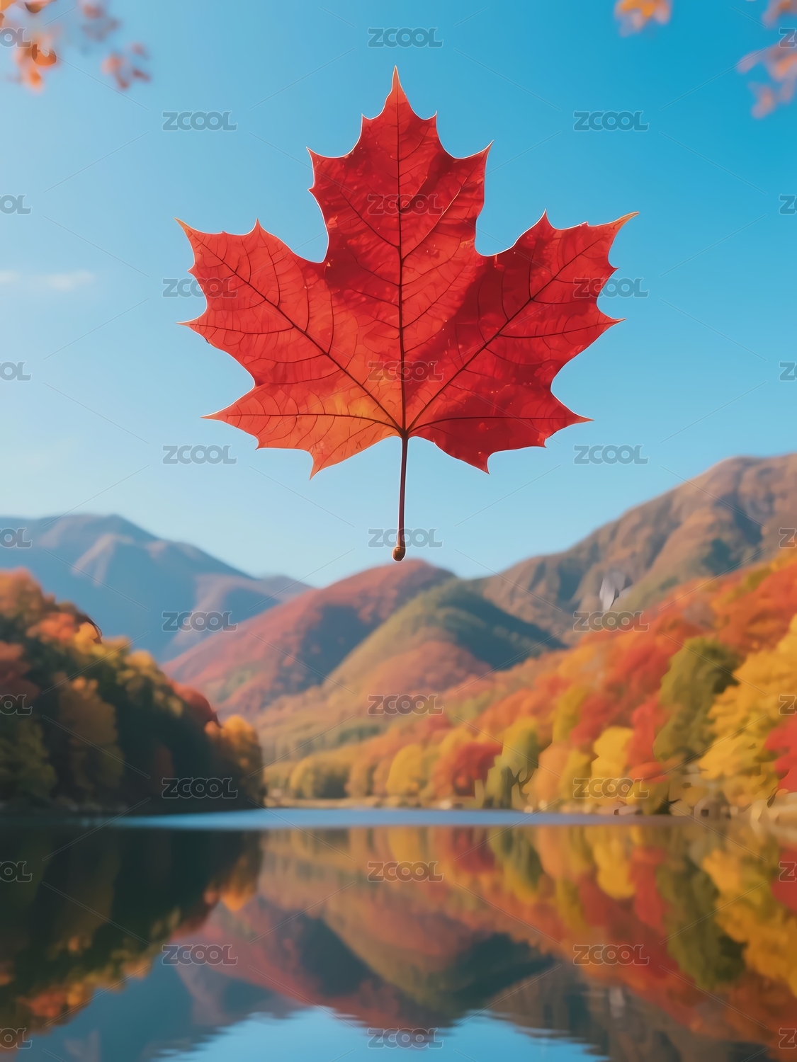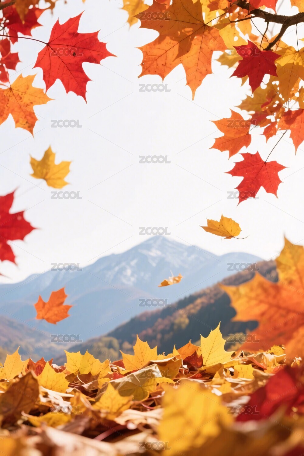 秋日枫叶与远山风景图