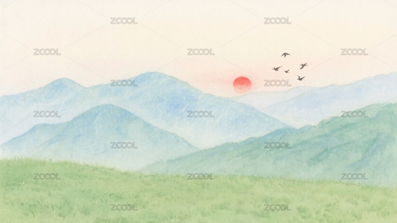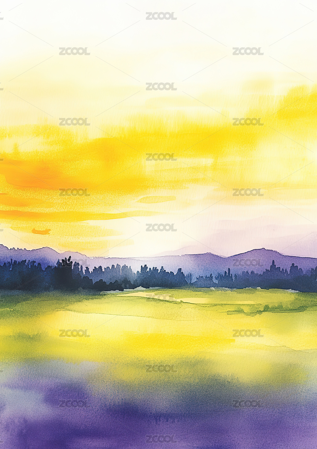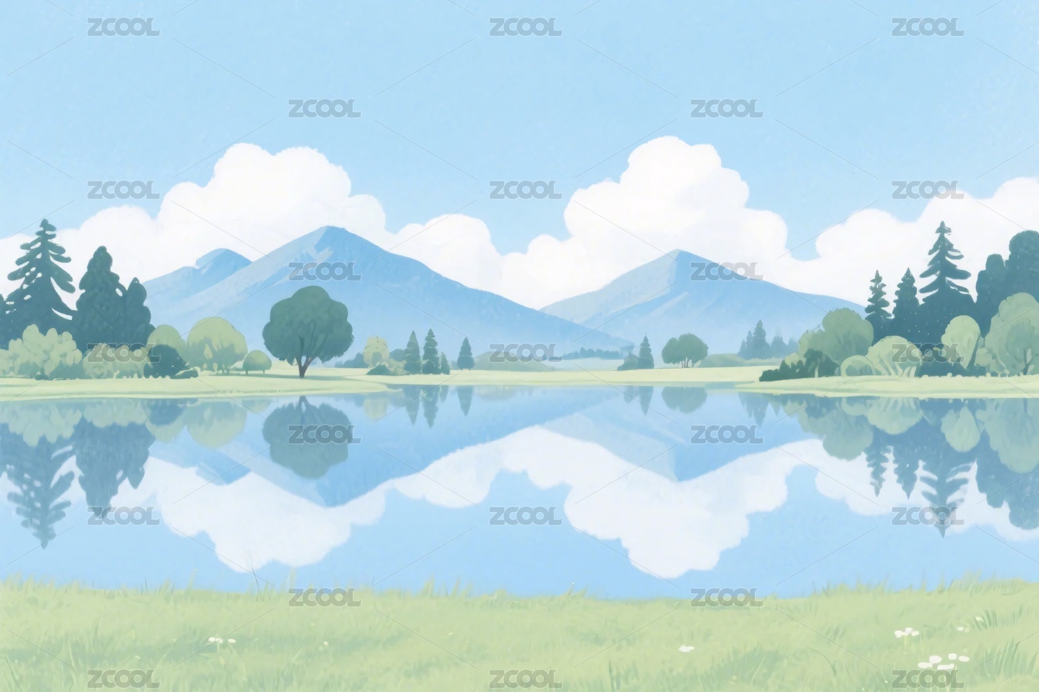 湖泊,山丘,树木,田园,自然,风景,插画,水彩,绘画,静谧
