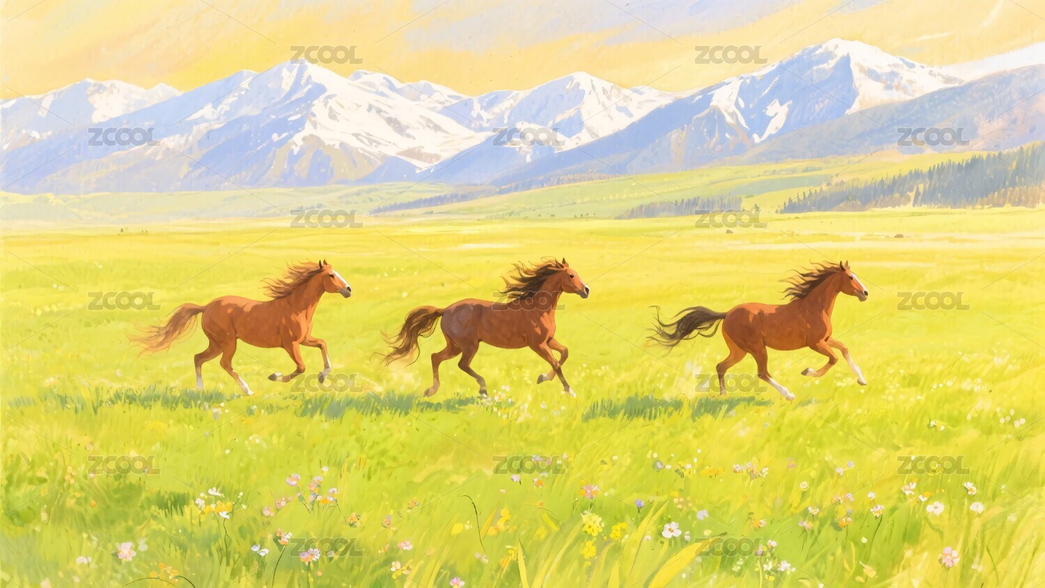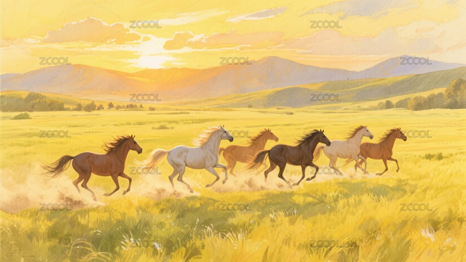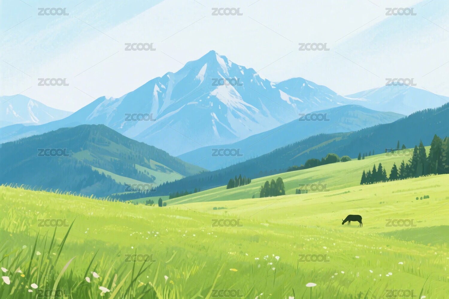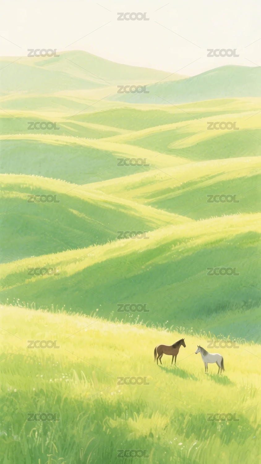 草原,山丘,阳光,乌云,插画,自然,风景,宁静,动物,光影