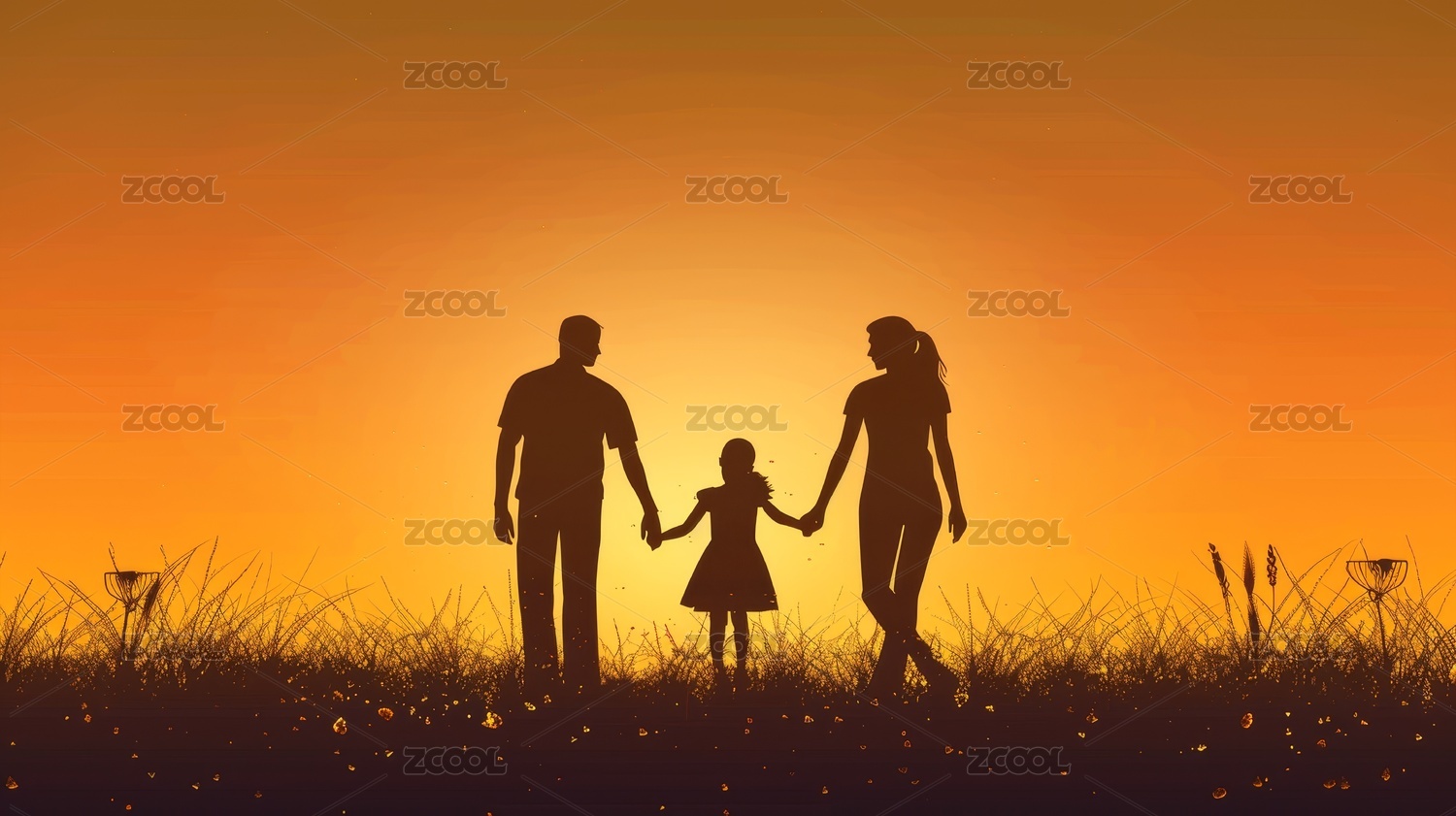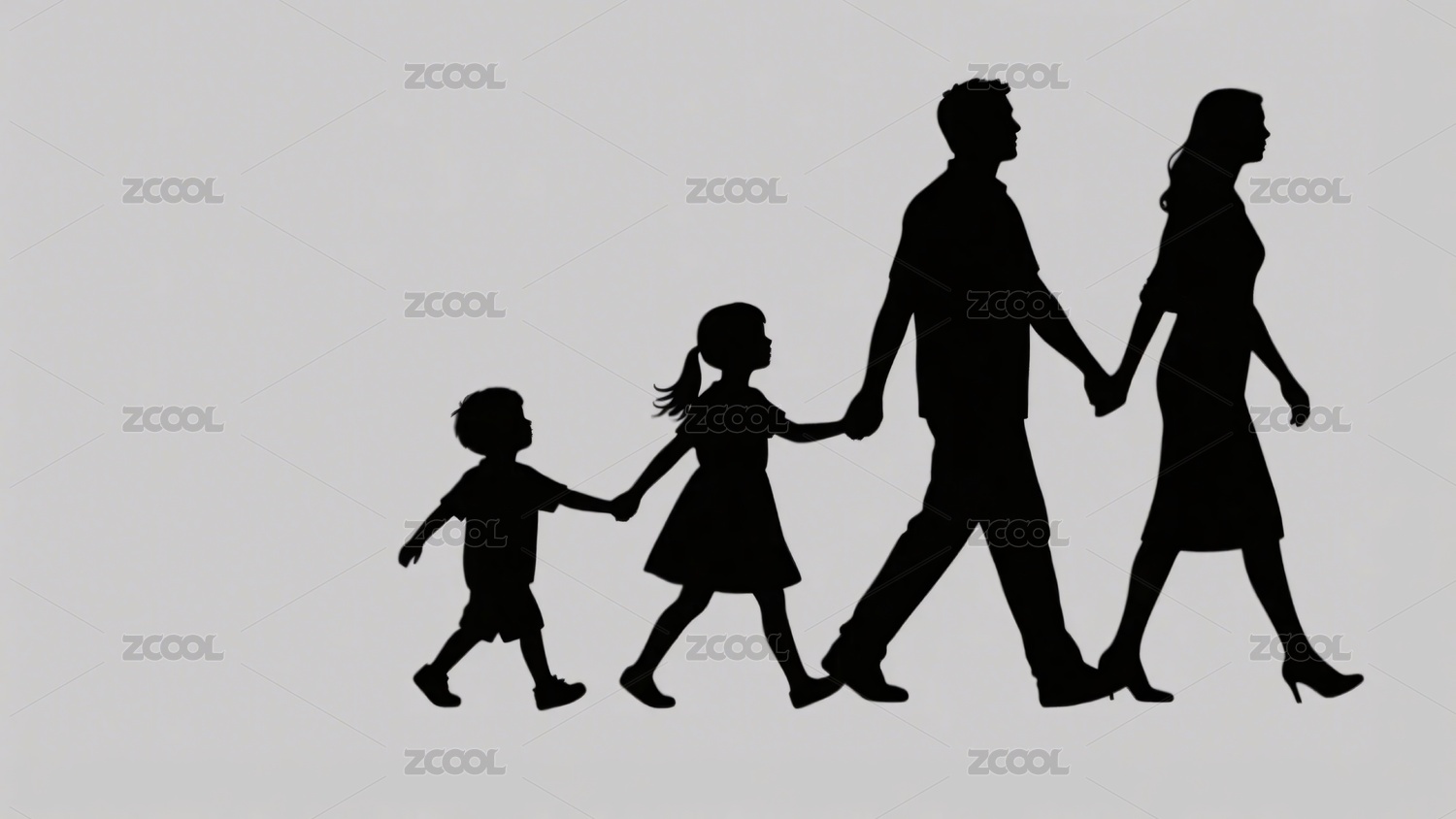 家庭,四人,牵手,行走,剪影,画面元素,亲情,主题词,插画