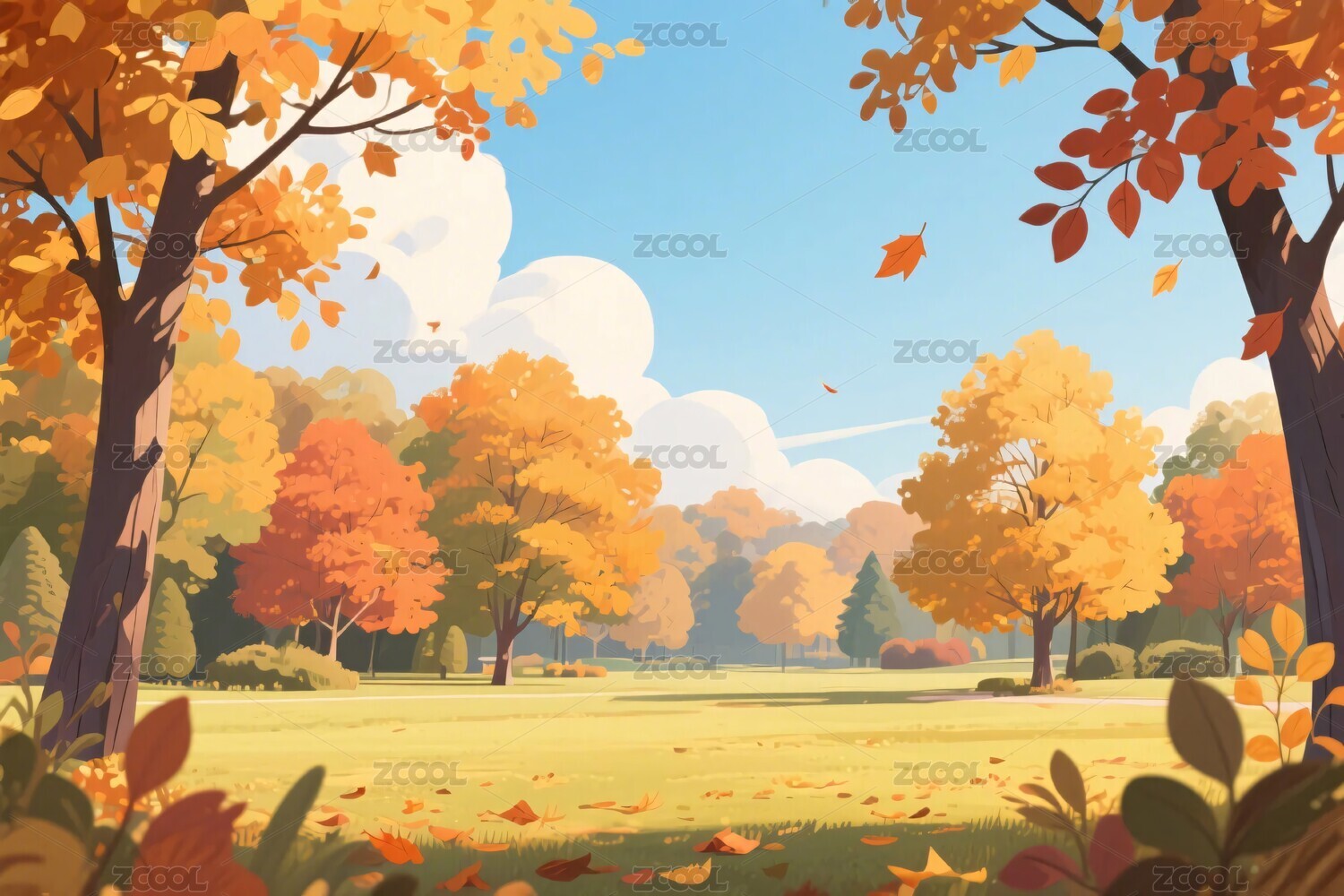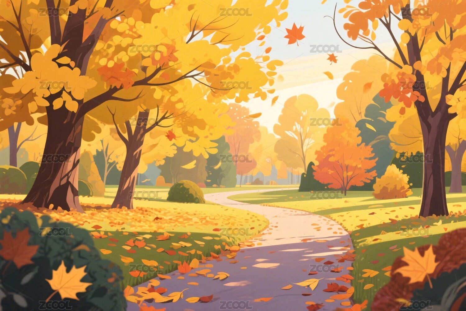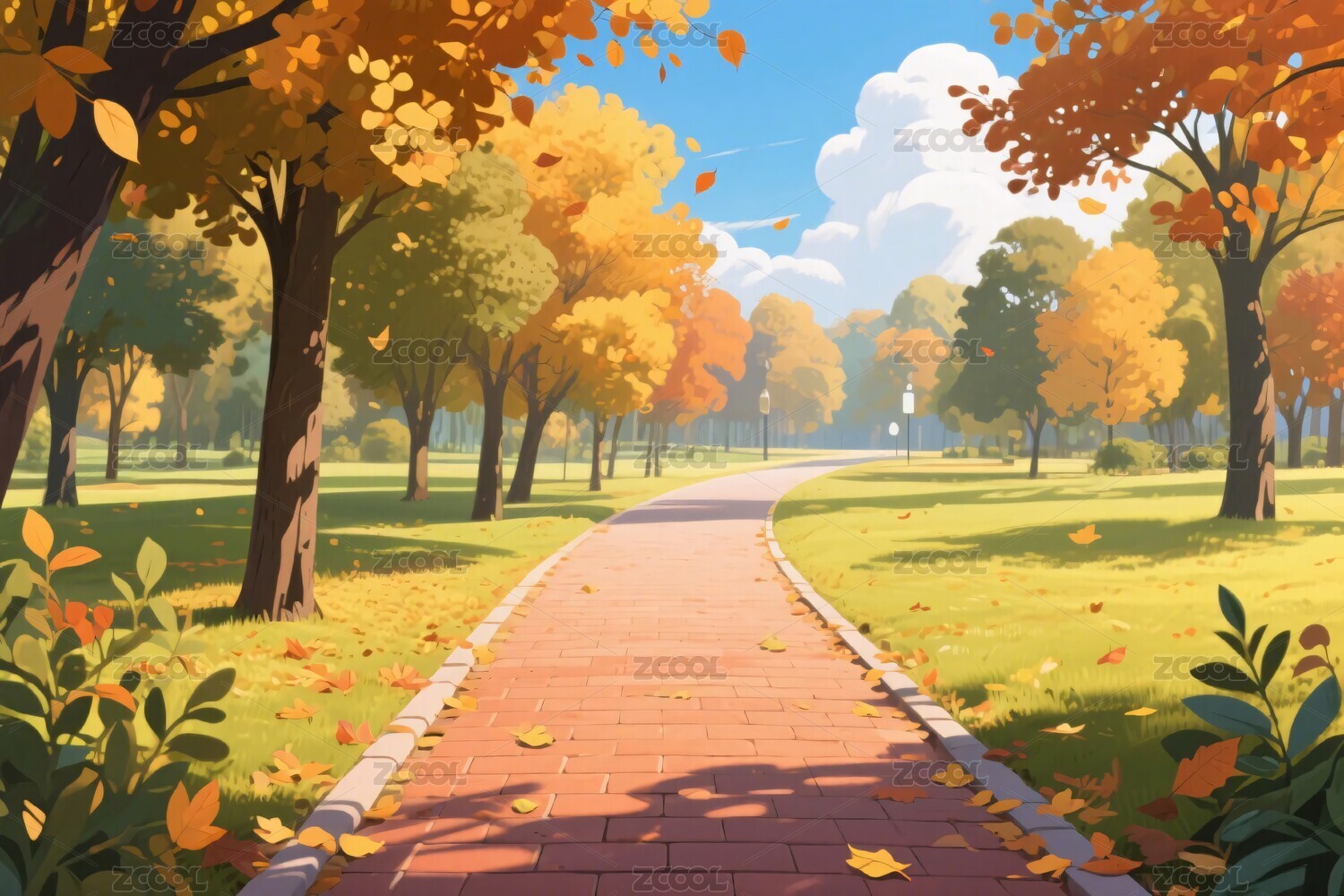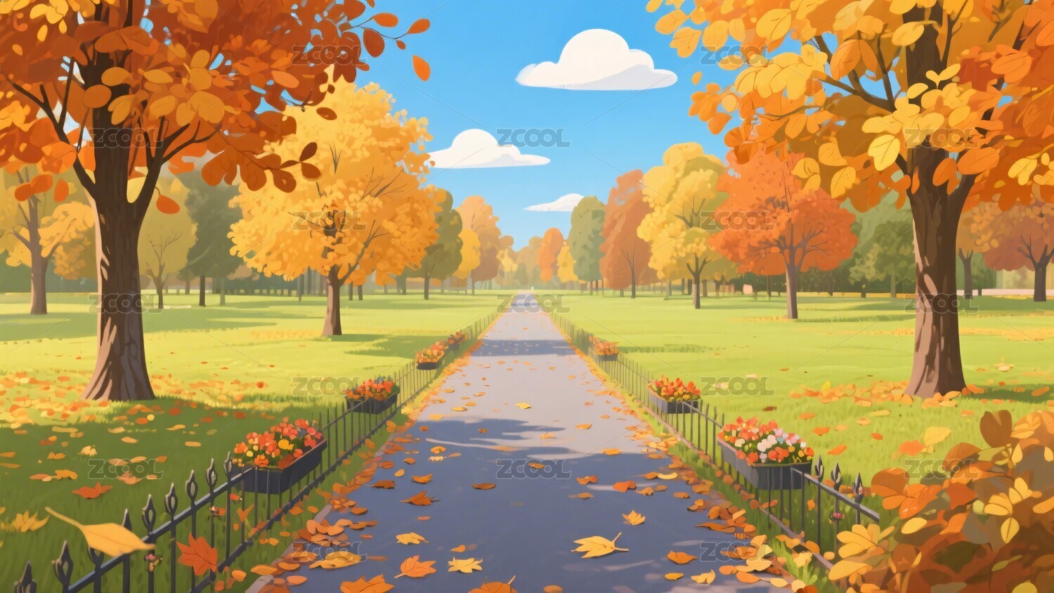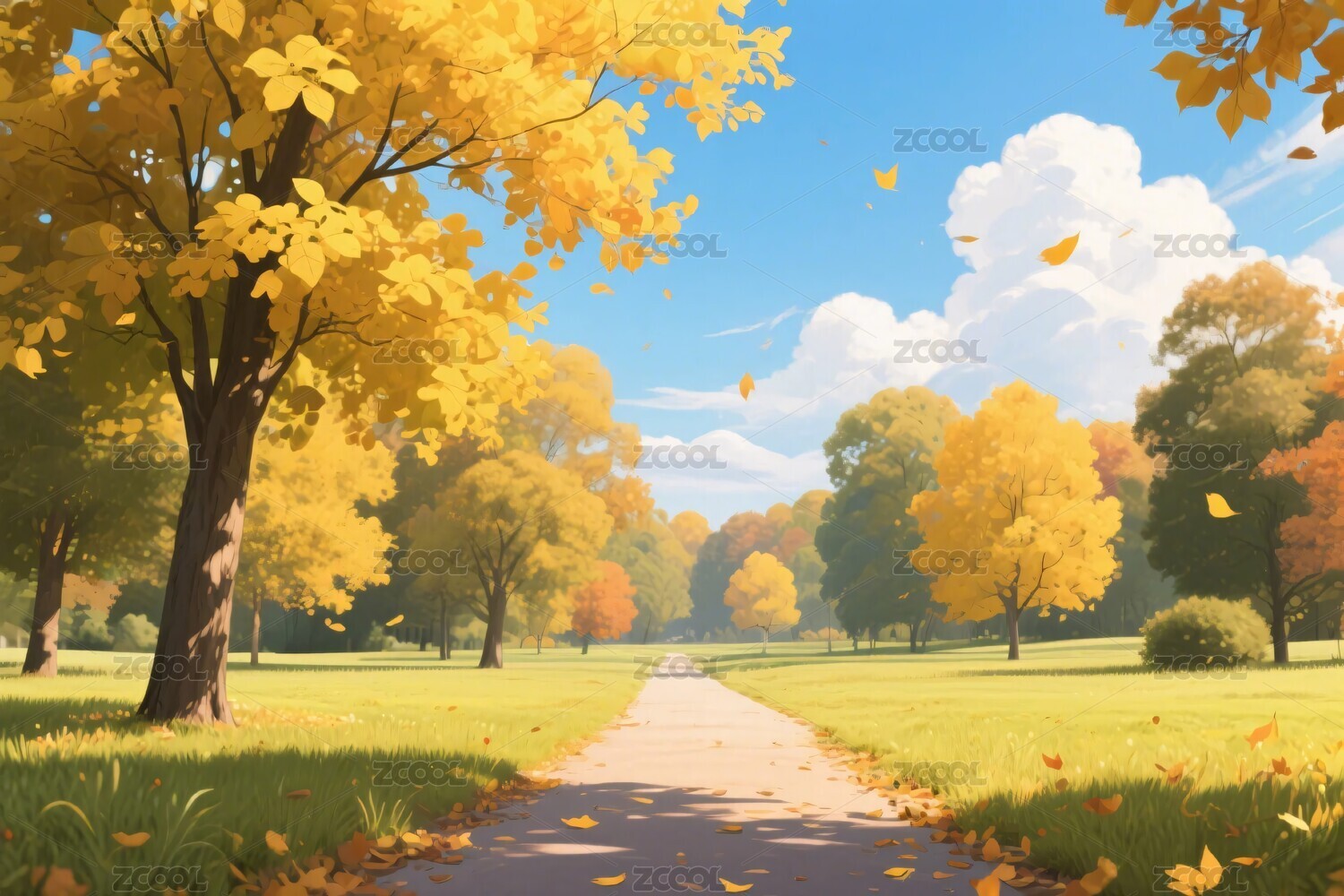 秋日,公园,小道,树木,草地,插画,风景,黄叶,白云,蓝天
