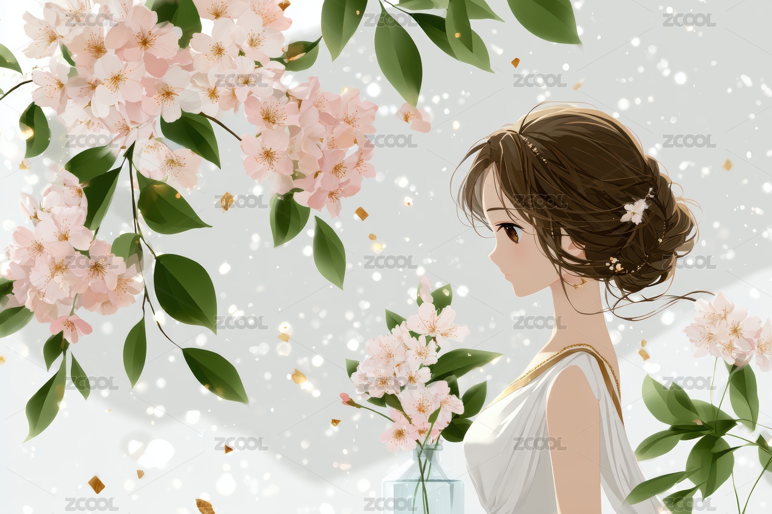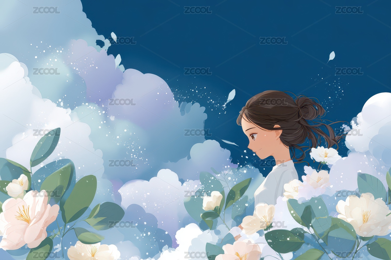 蓝天,花海,梦幻,绿叶,白云,少女,清新,花瓣,仰望