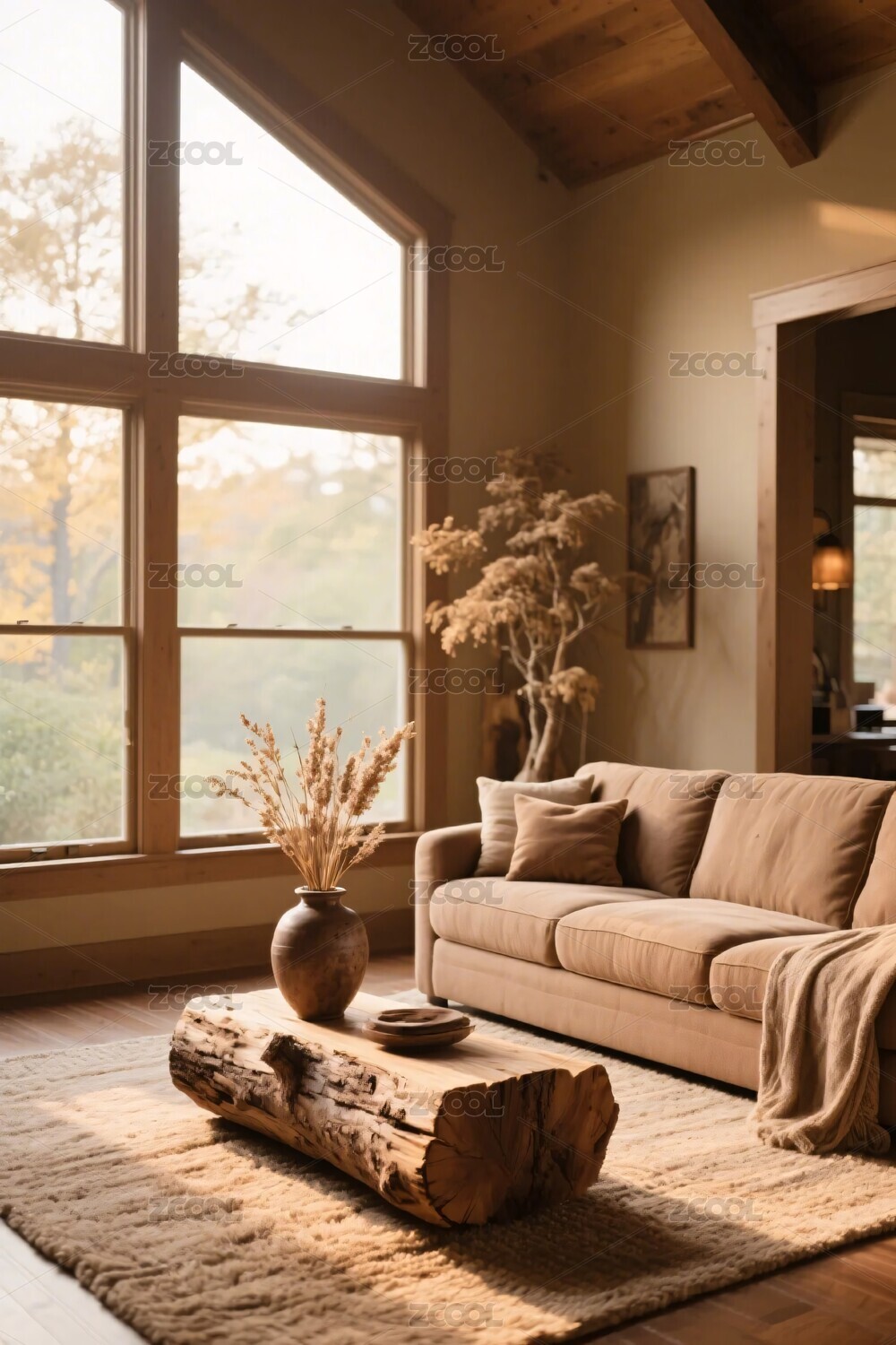 温馨客厅,窗外秋景映衬室内暖意