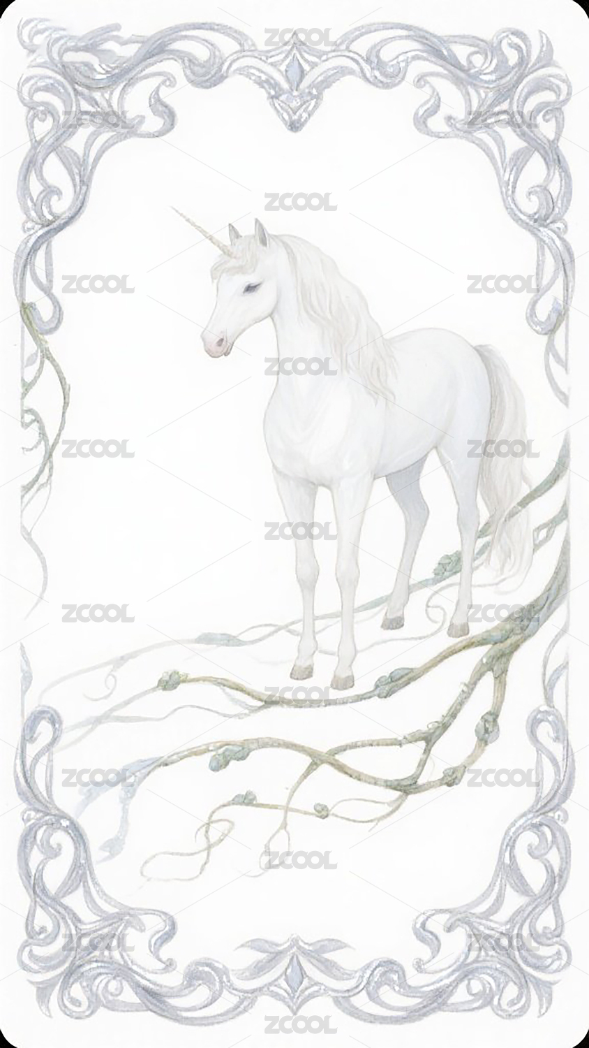 银纹边框环绕雪白独角兽与藤蔓插画