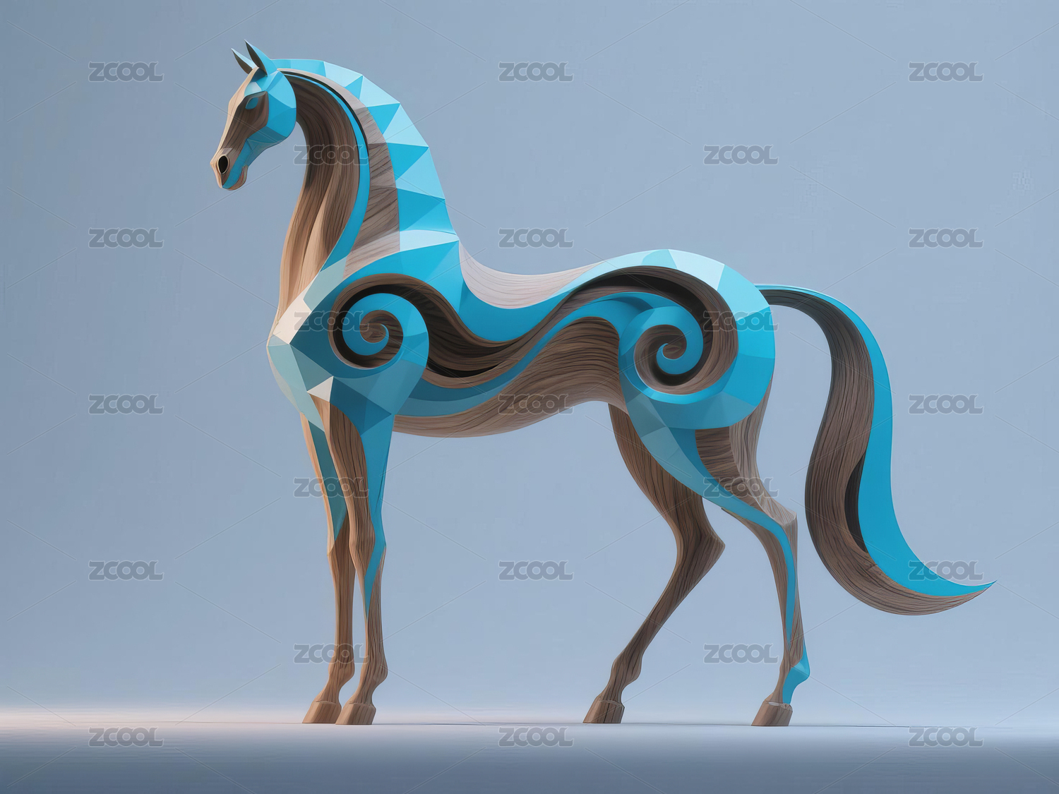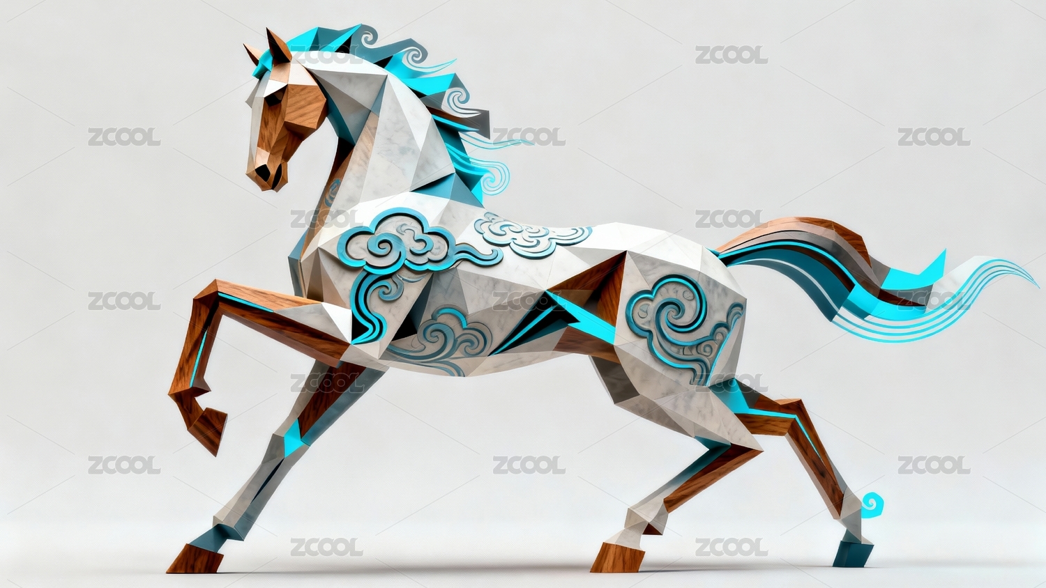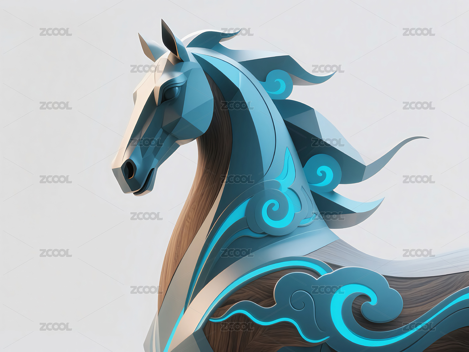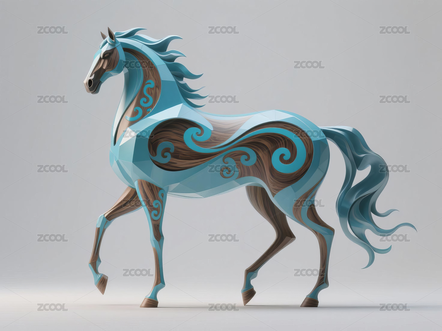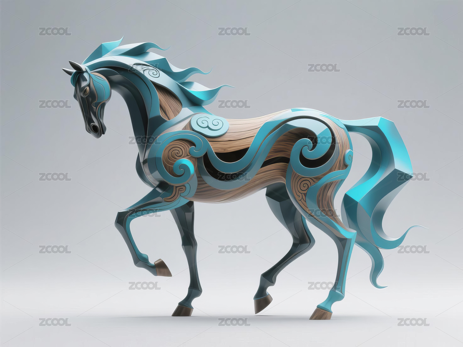 马年,骏马,腾跃,木质,雕塑,深棕,纹理,蓝绿,云纹,装饰