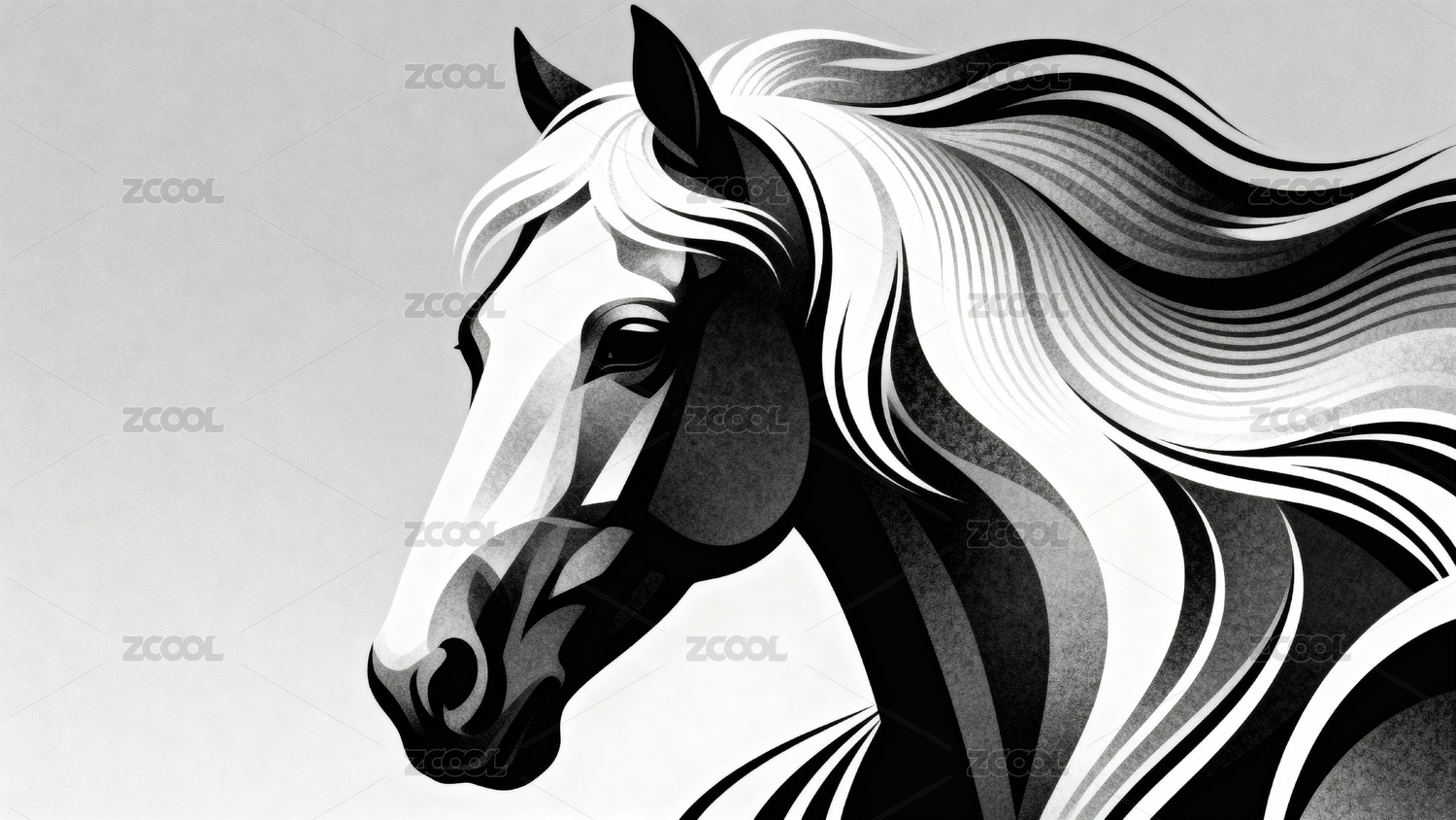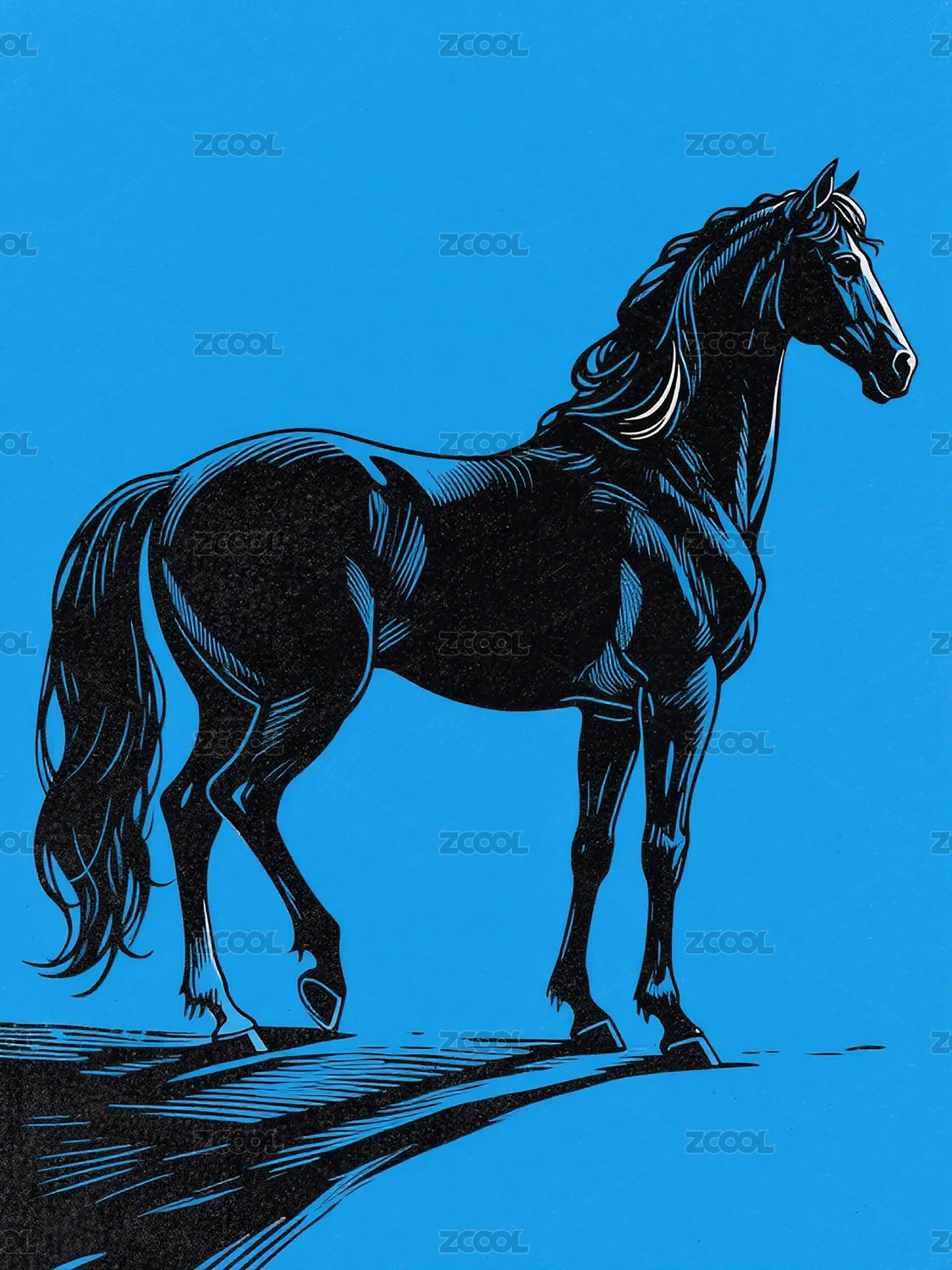 马年,骏马,黑色,侧影,挺立,昂首,鬃毛,浓密,飘逸,肌肉