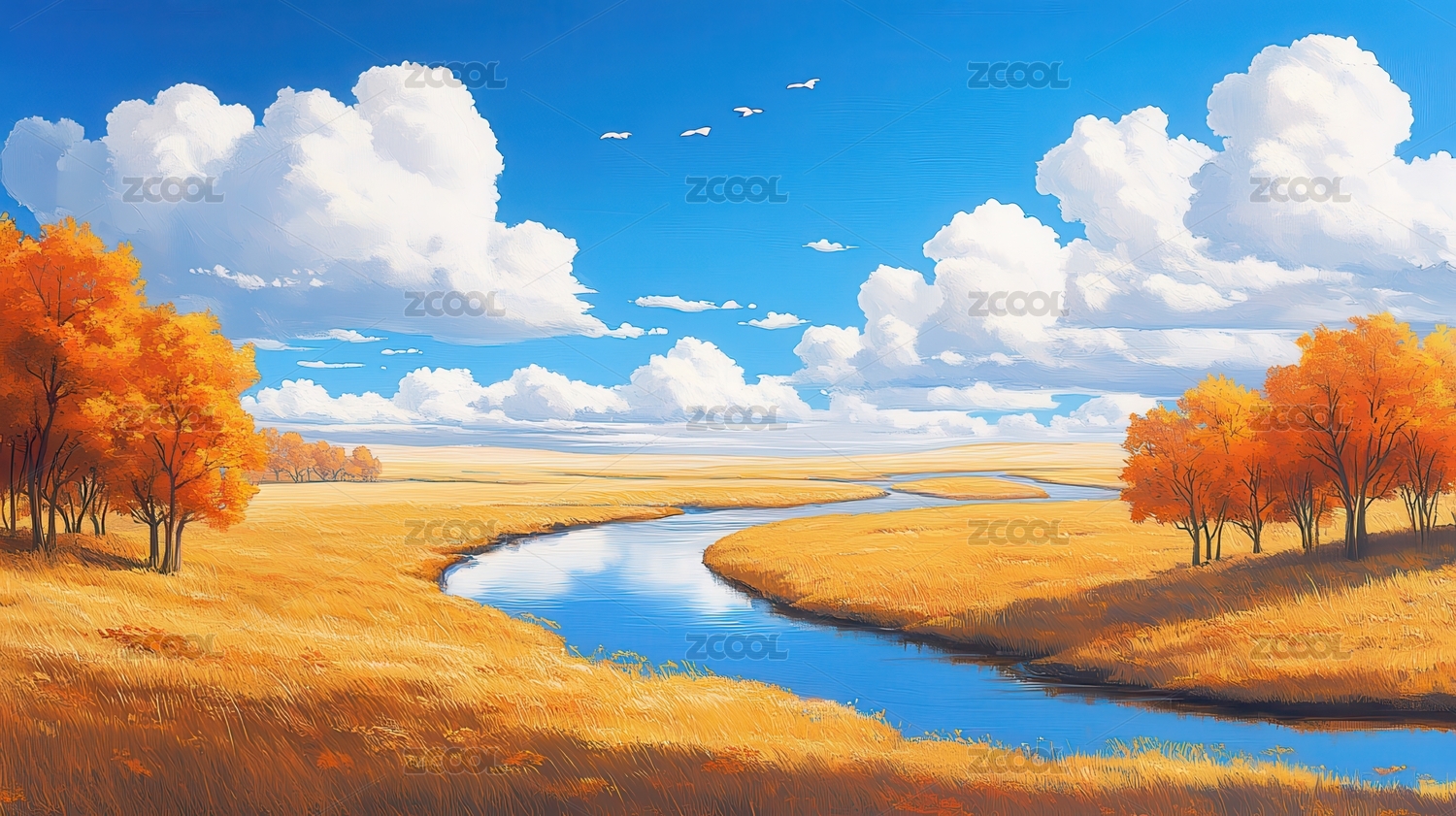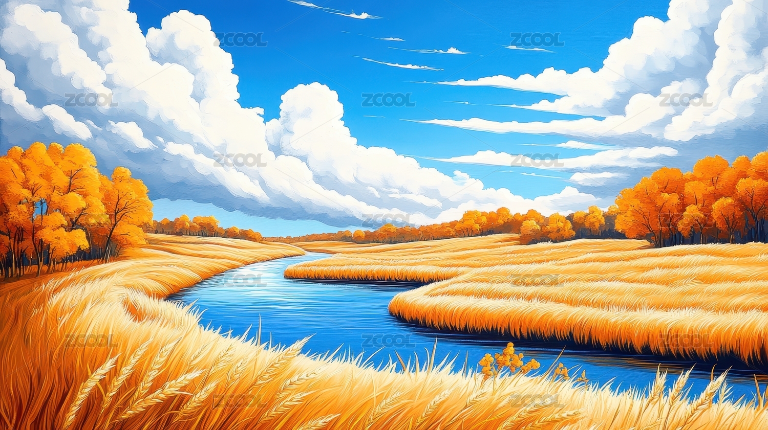 秋日河流与金黄麦田