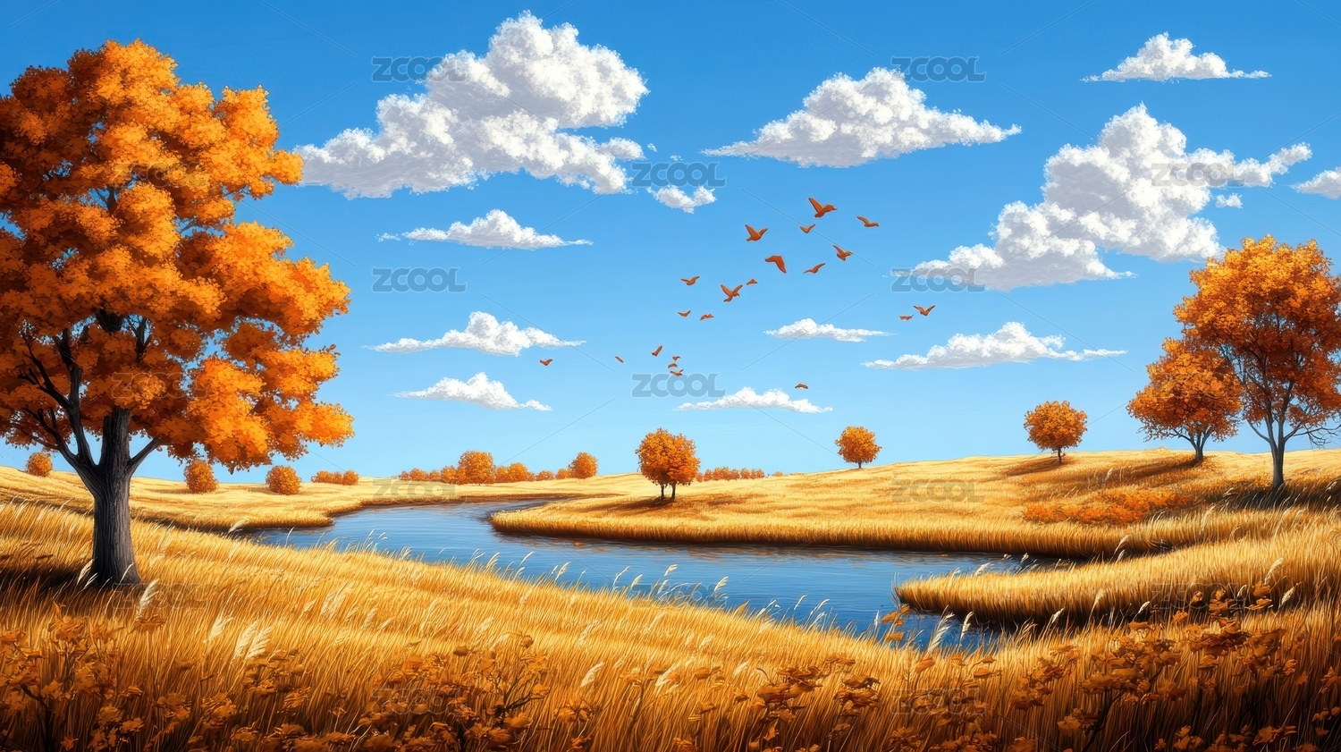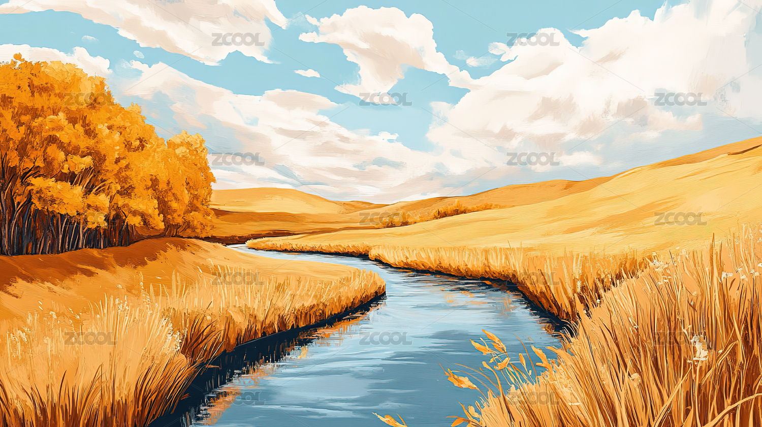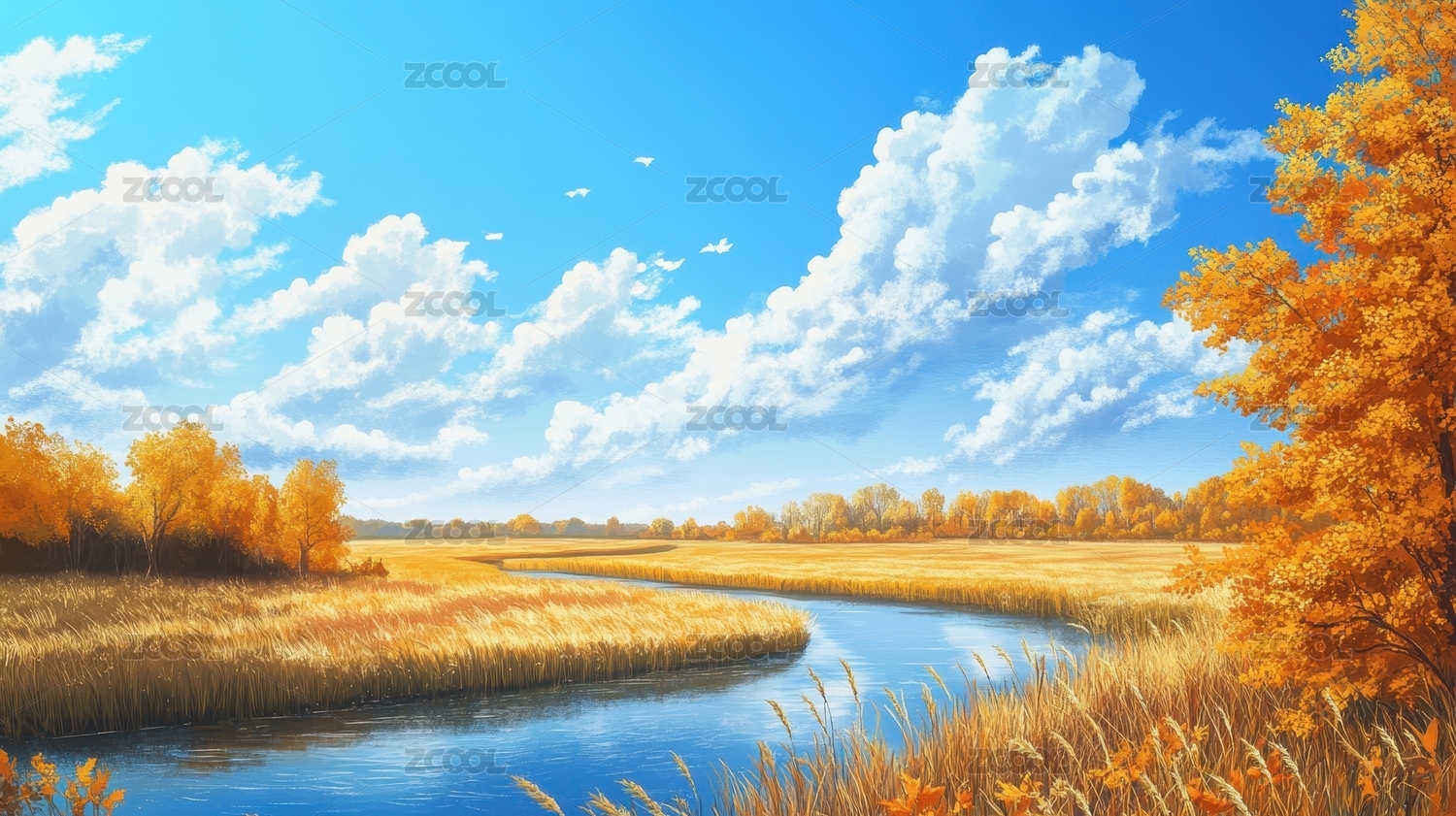 秋日河边金色田野