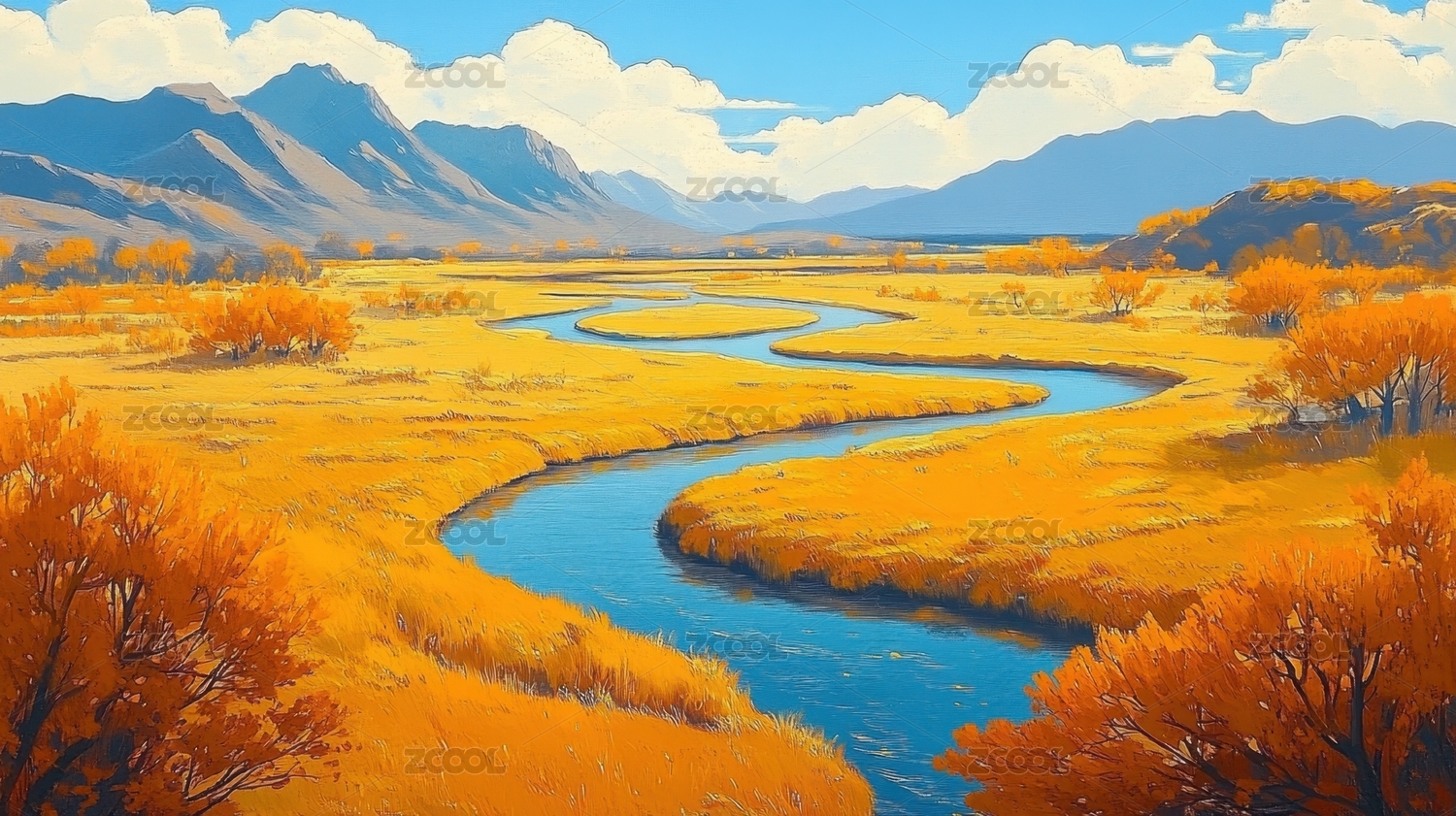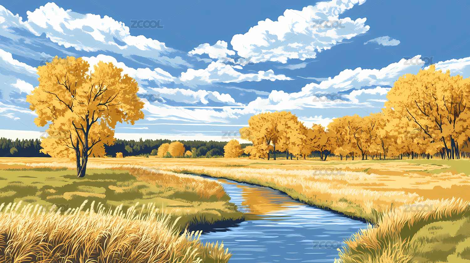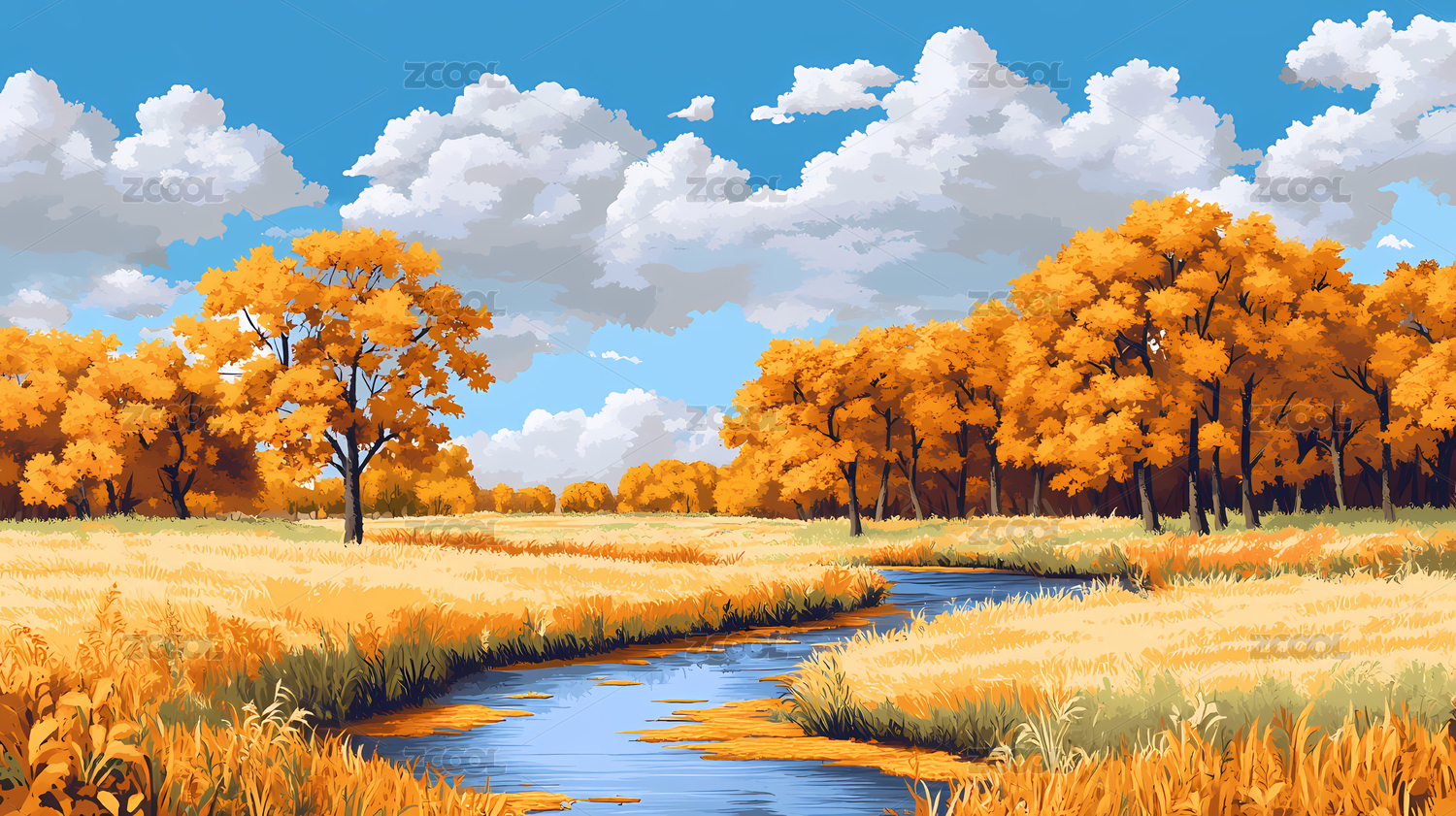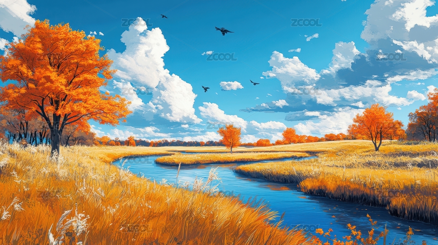秋日田园金色河流