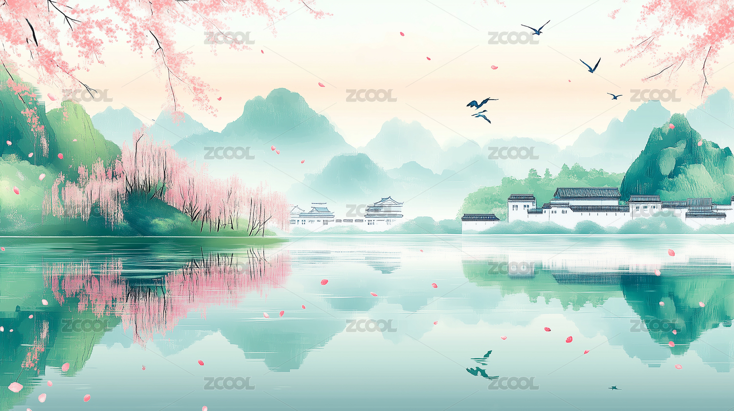 山水,建筑,传统,艺术,绘画,自然,创意,湖泊,风景,宁静