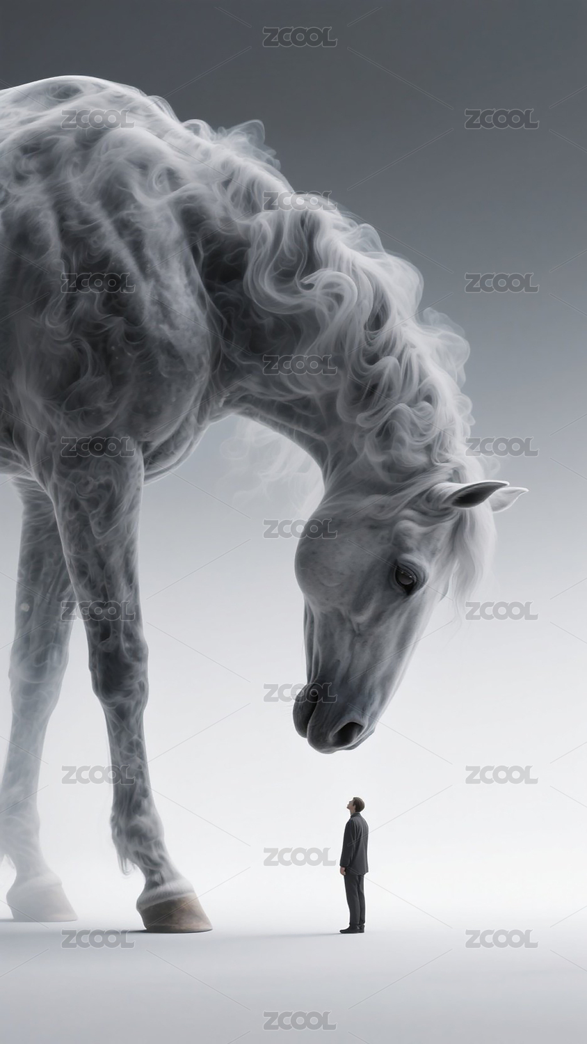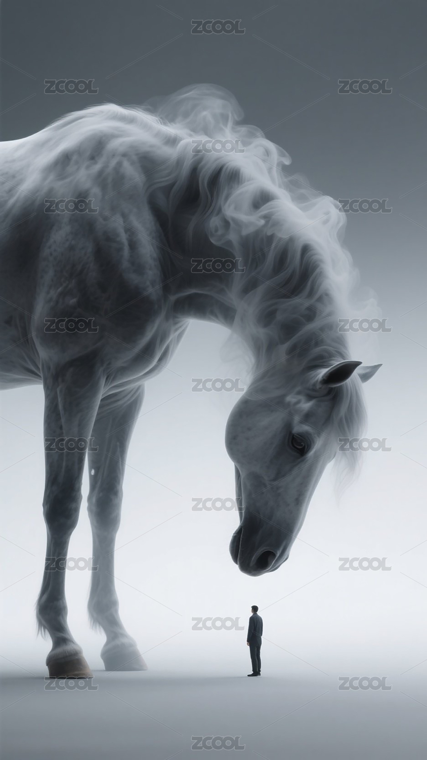 马年,巨马,白马,烟雾,鬃毛,灰白,色调,低首,温和,深邃