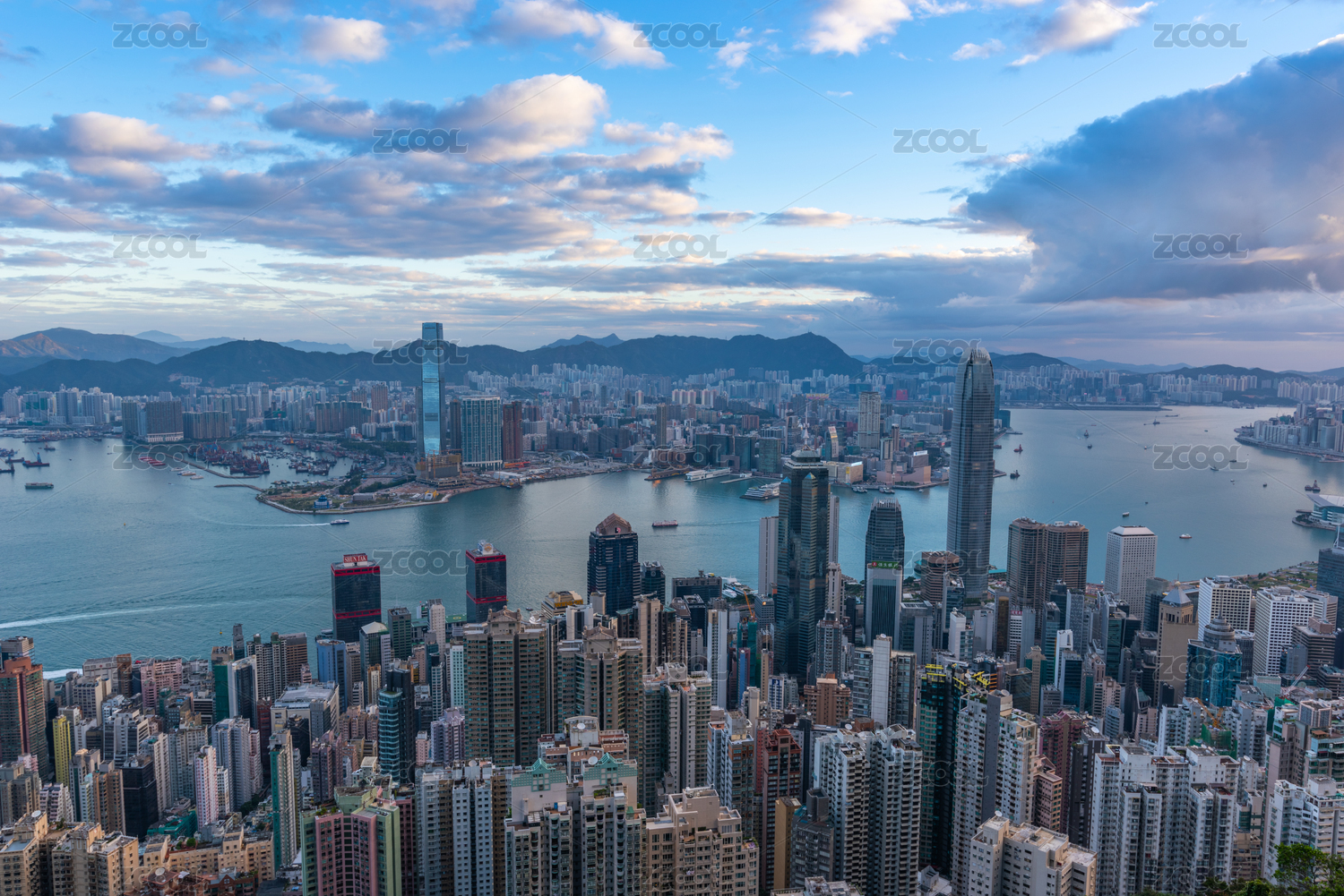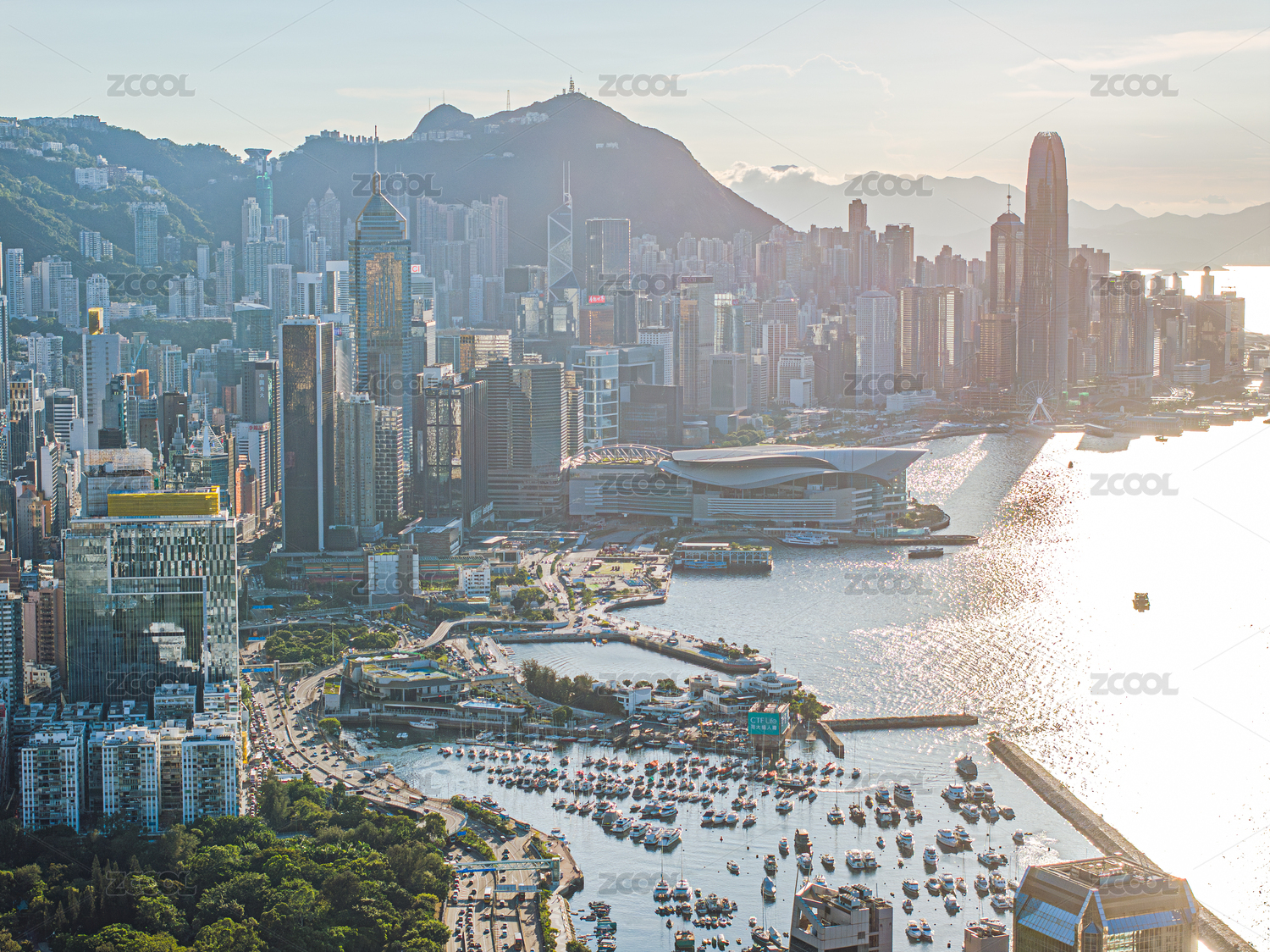 航拍,日落,黄昏,香港,维多利亚港,海湾,建筑群,中国香港,中国,城市