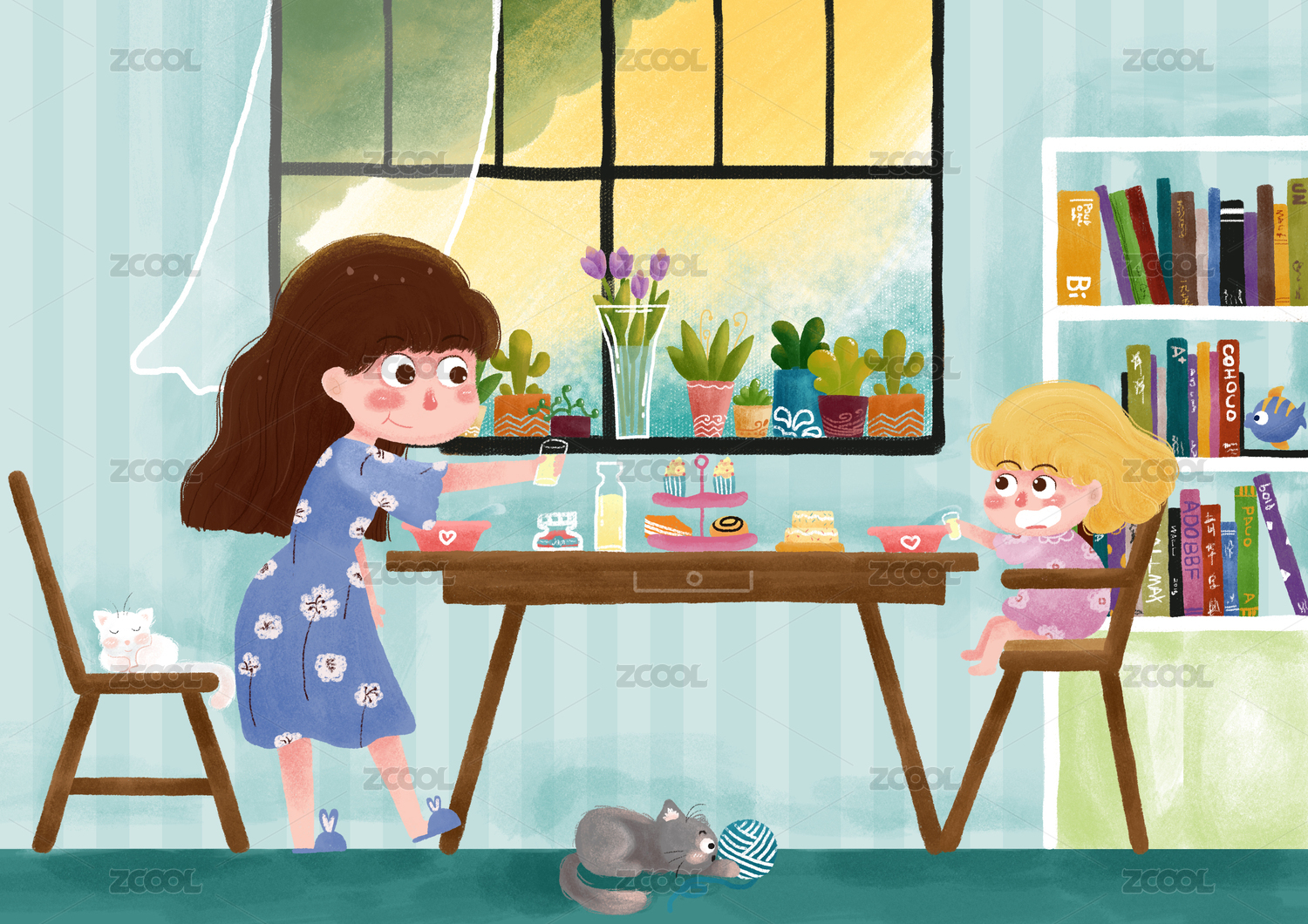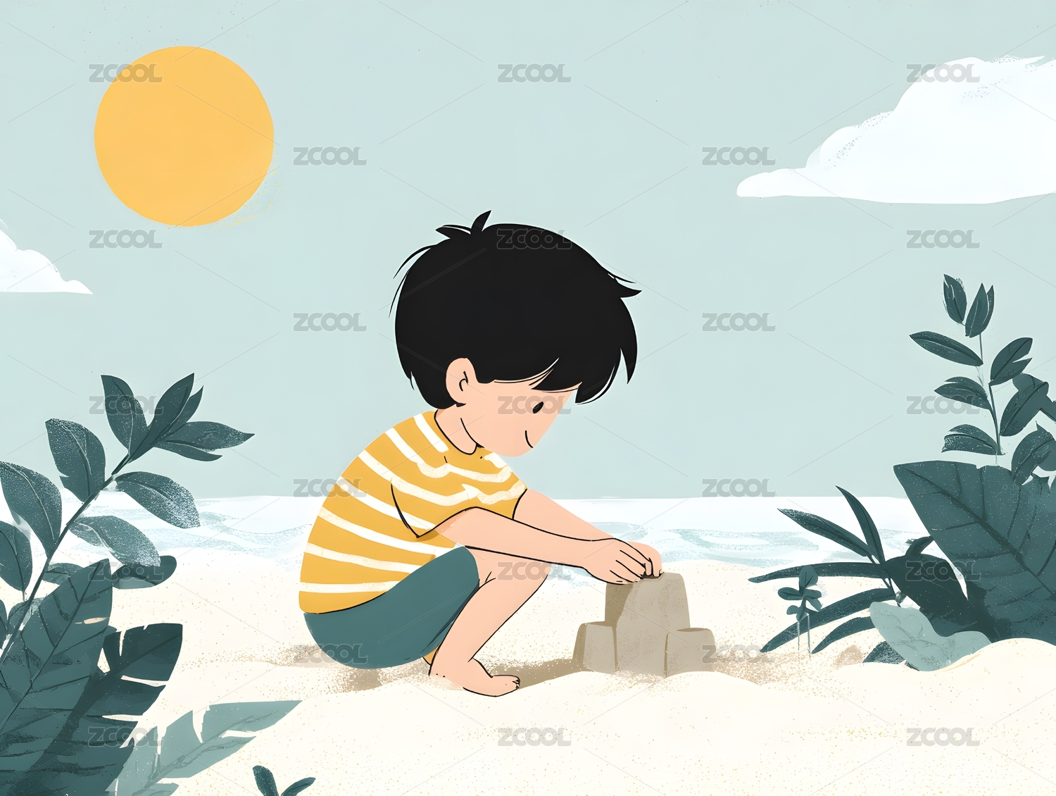 海滩男孩堆沙堡 阳光明媚 水彩画