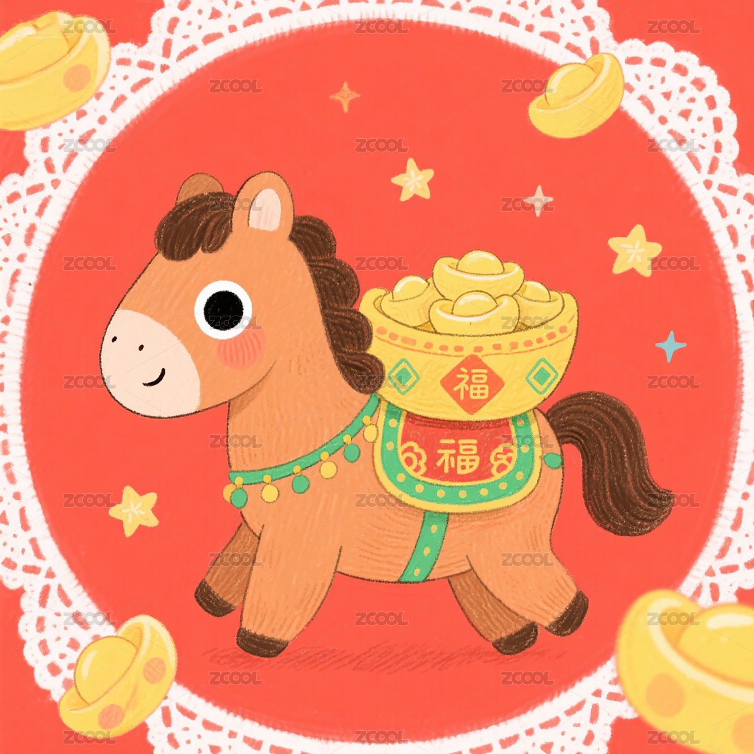 抱元宝贺岁小马福字背景卡通插画