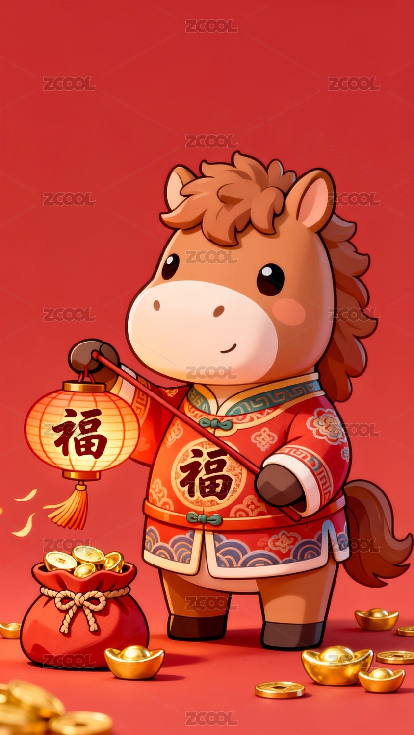 卡通小马手持红灯笼与金元宝