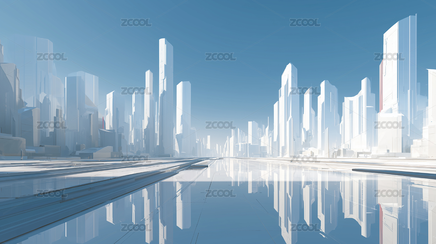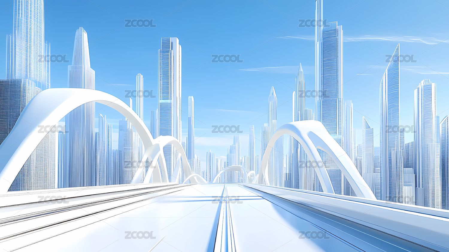 白色科幻未来城市道路侧高楼群建筑3D插画