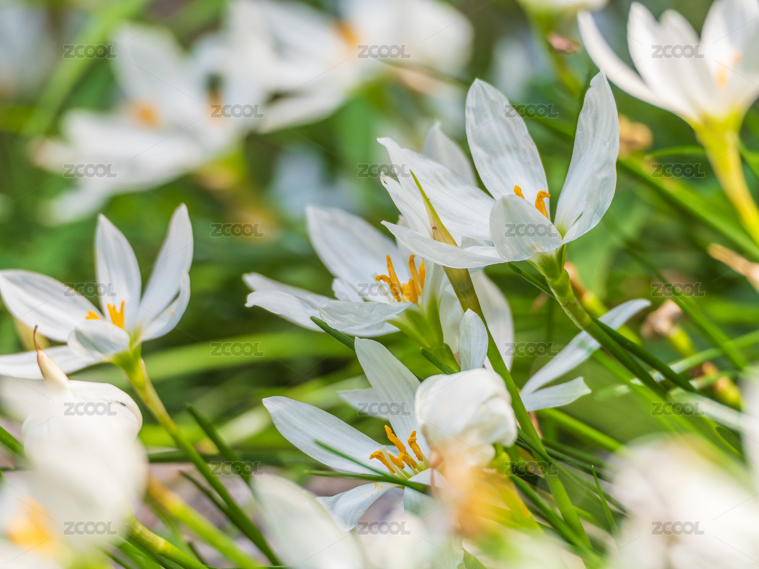晴朗天气下土地上盛放着白色的葱莲鲜花草药