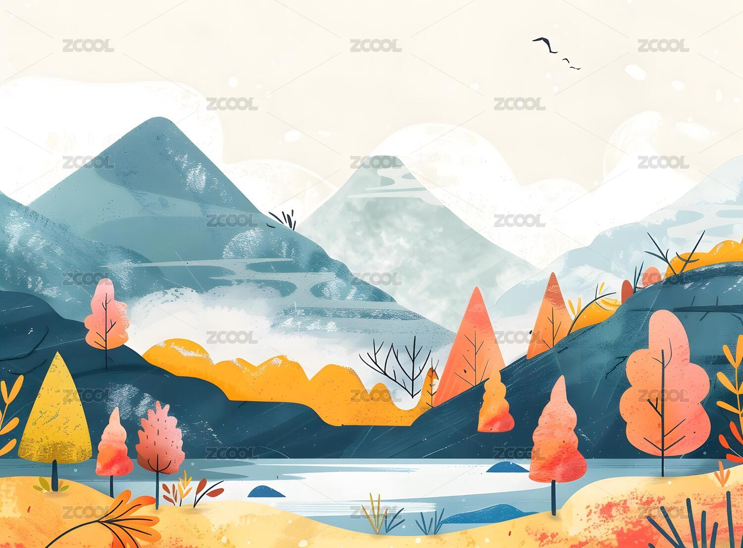风景,秋天,树木,山脉,湖泊,蝴蝶,绿色,橙色,红色,蓝色