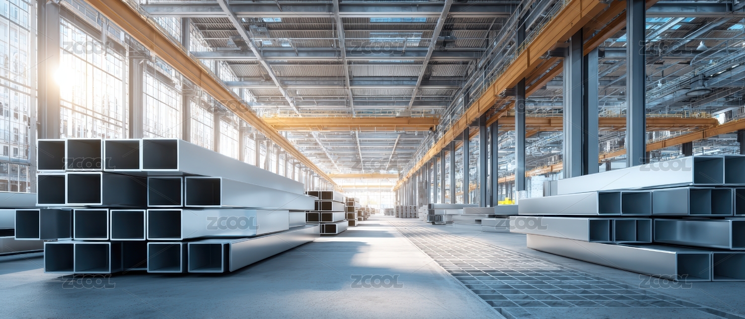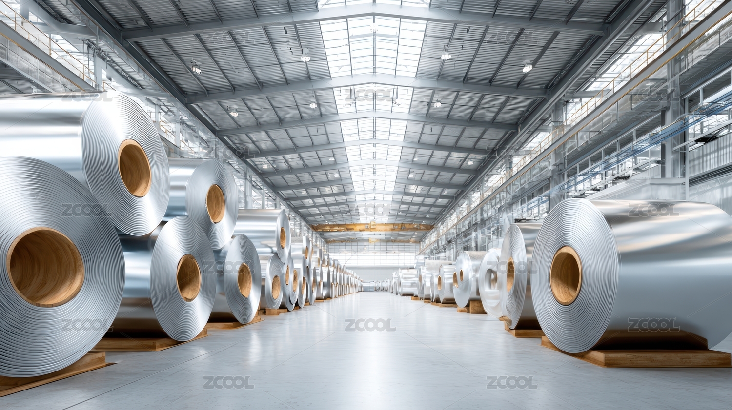 现代工厂车间整齐排列钢卷特写中国制造概念