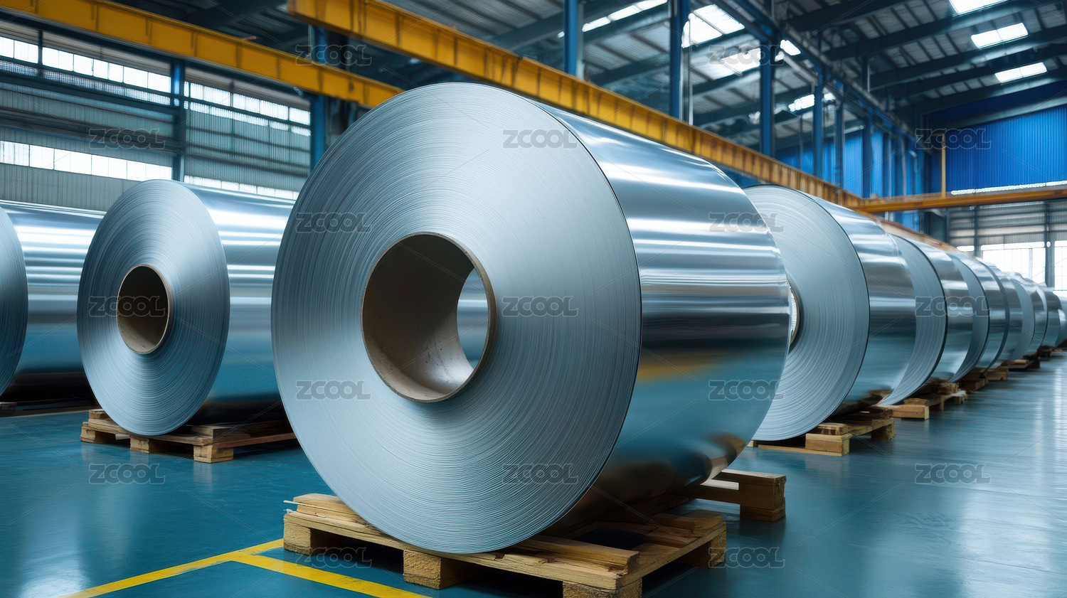 现代工厂车间整齐排列钢卷特写中国制造概念