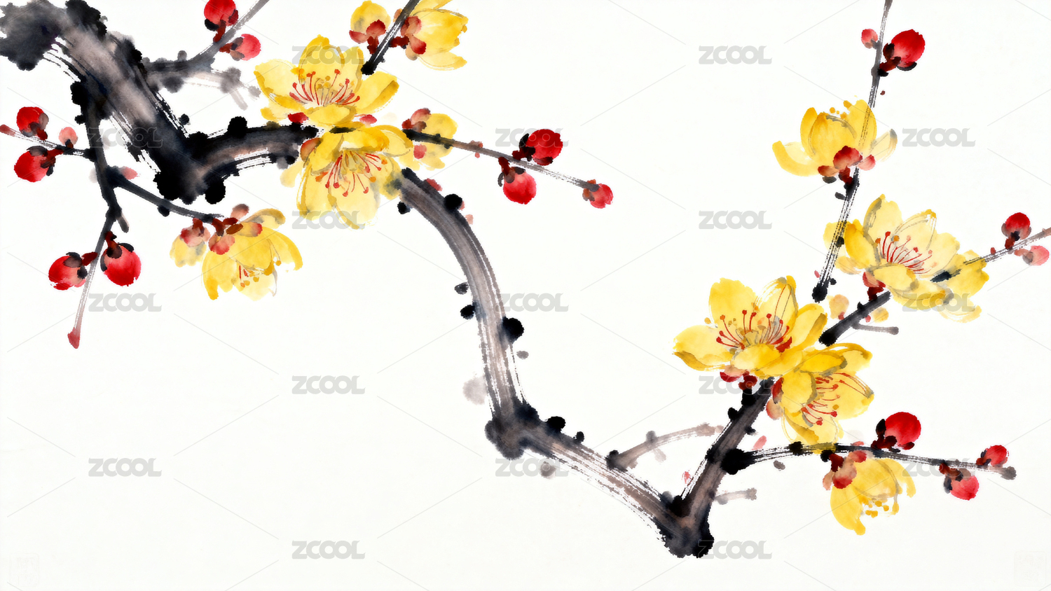 水墨腊梅枝头黄花
