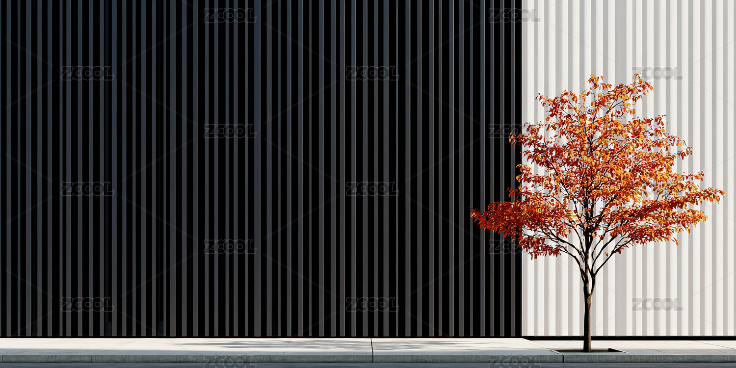秋叶树前的黑白条纹墙