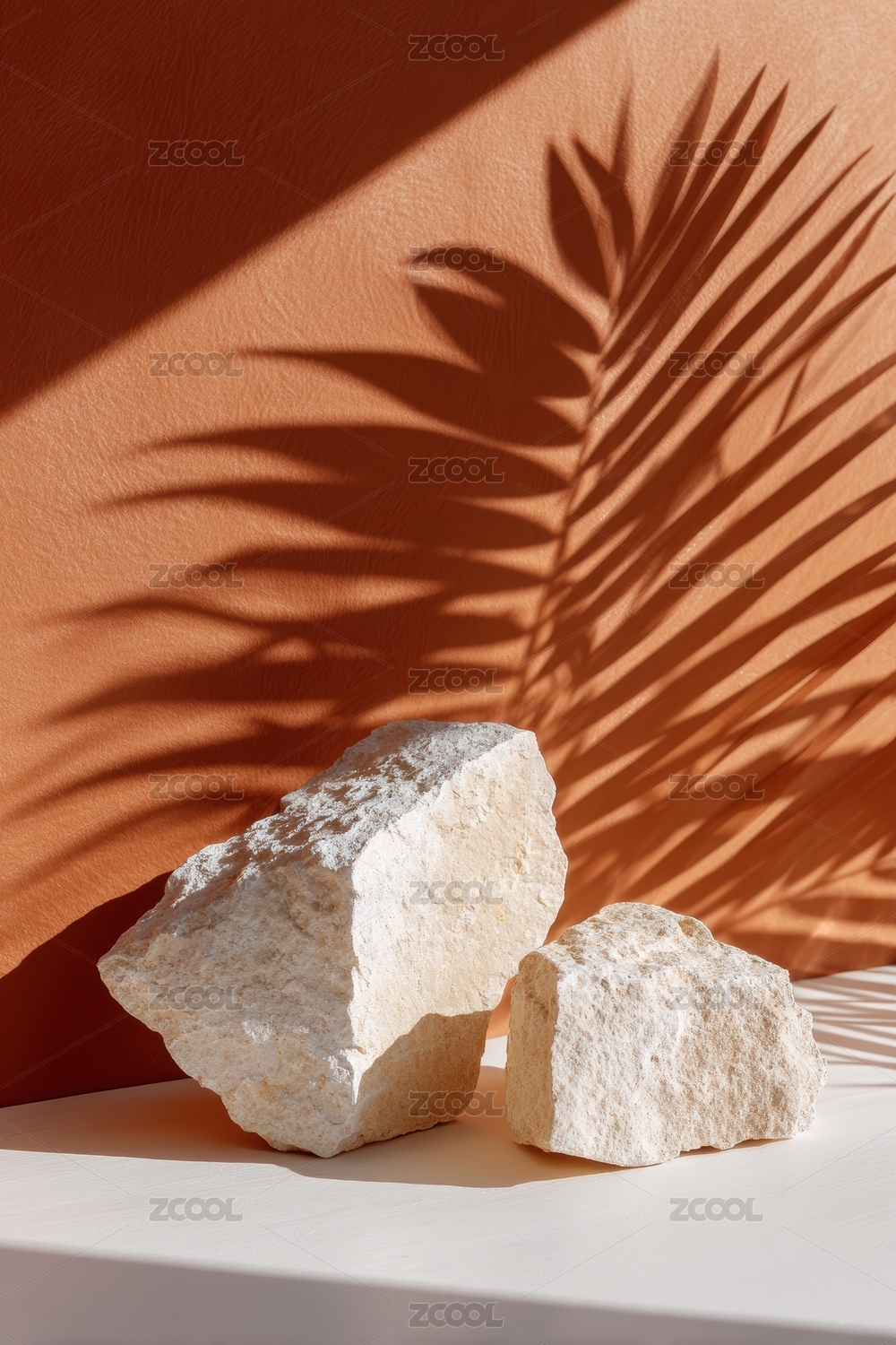 光影交错的棕榈叶与岩石静物