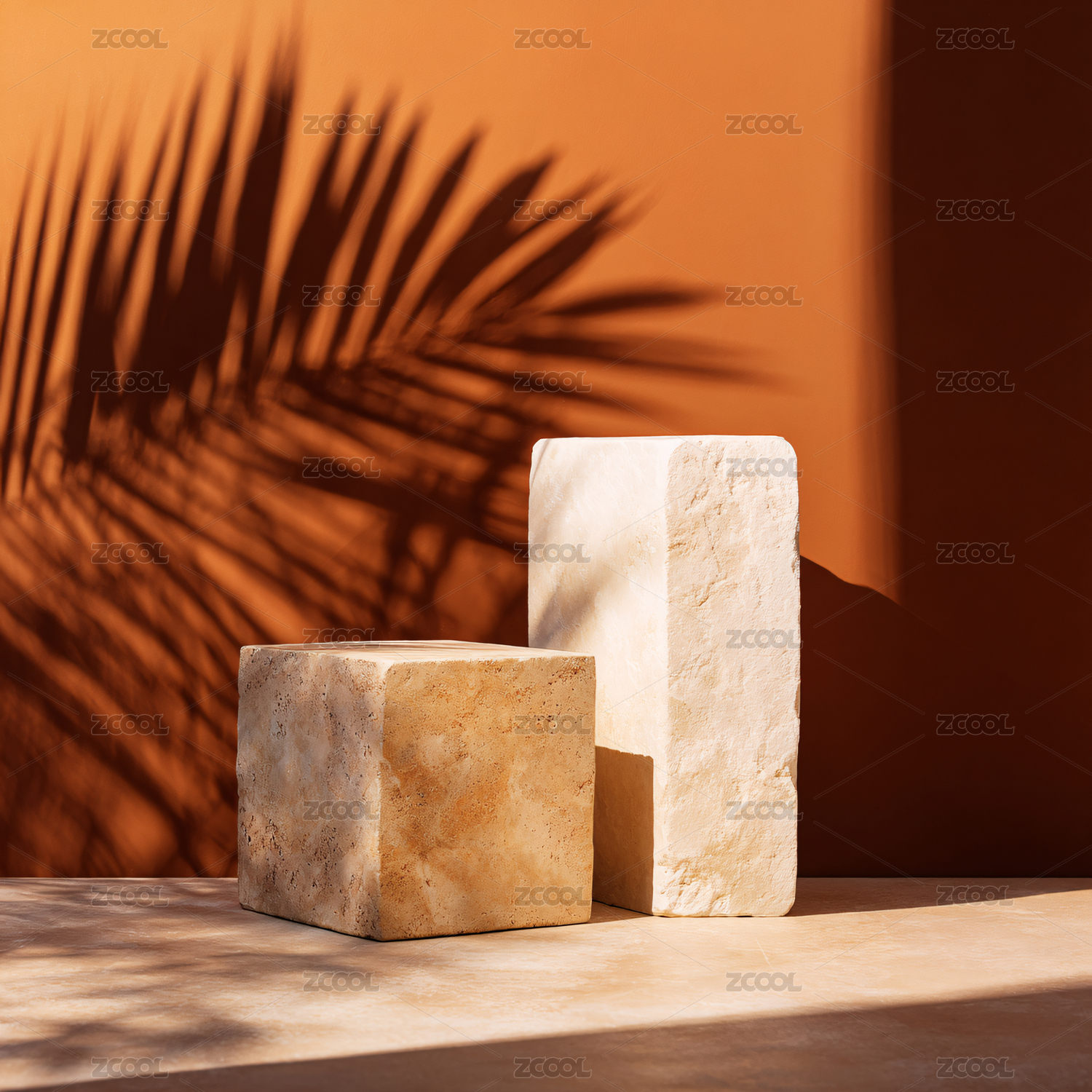 棕榈光影下的极简几何产品展台