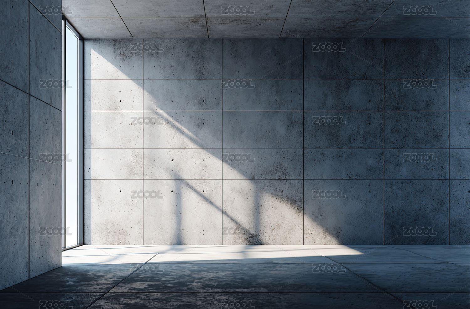 空旷混凝土房间,阳光透过窗户洒入