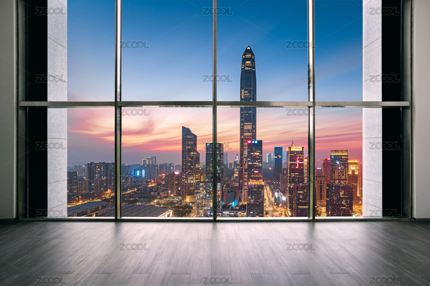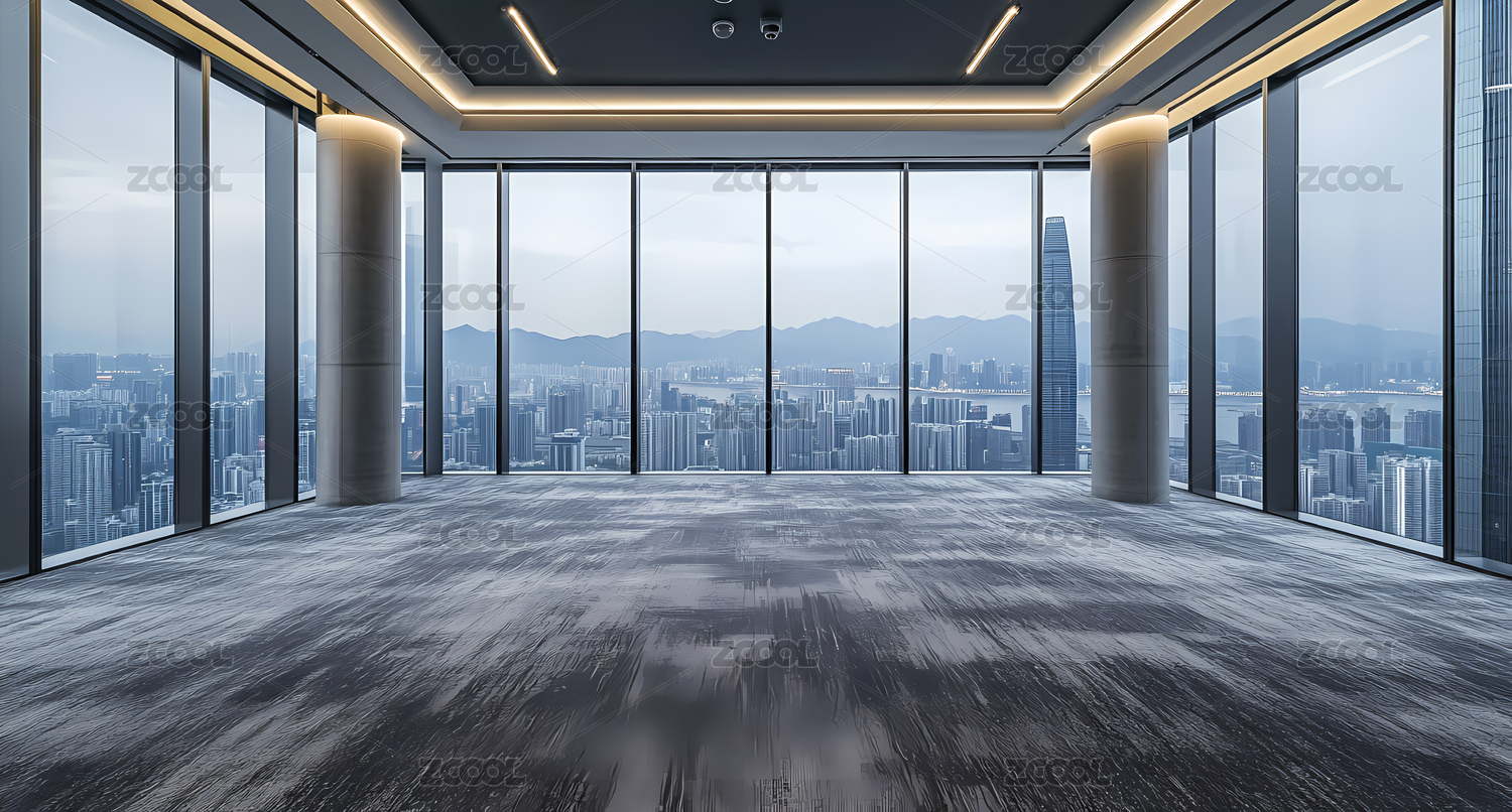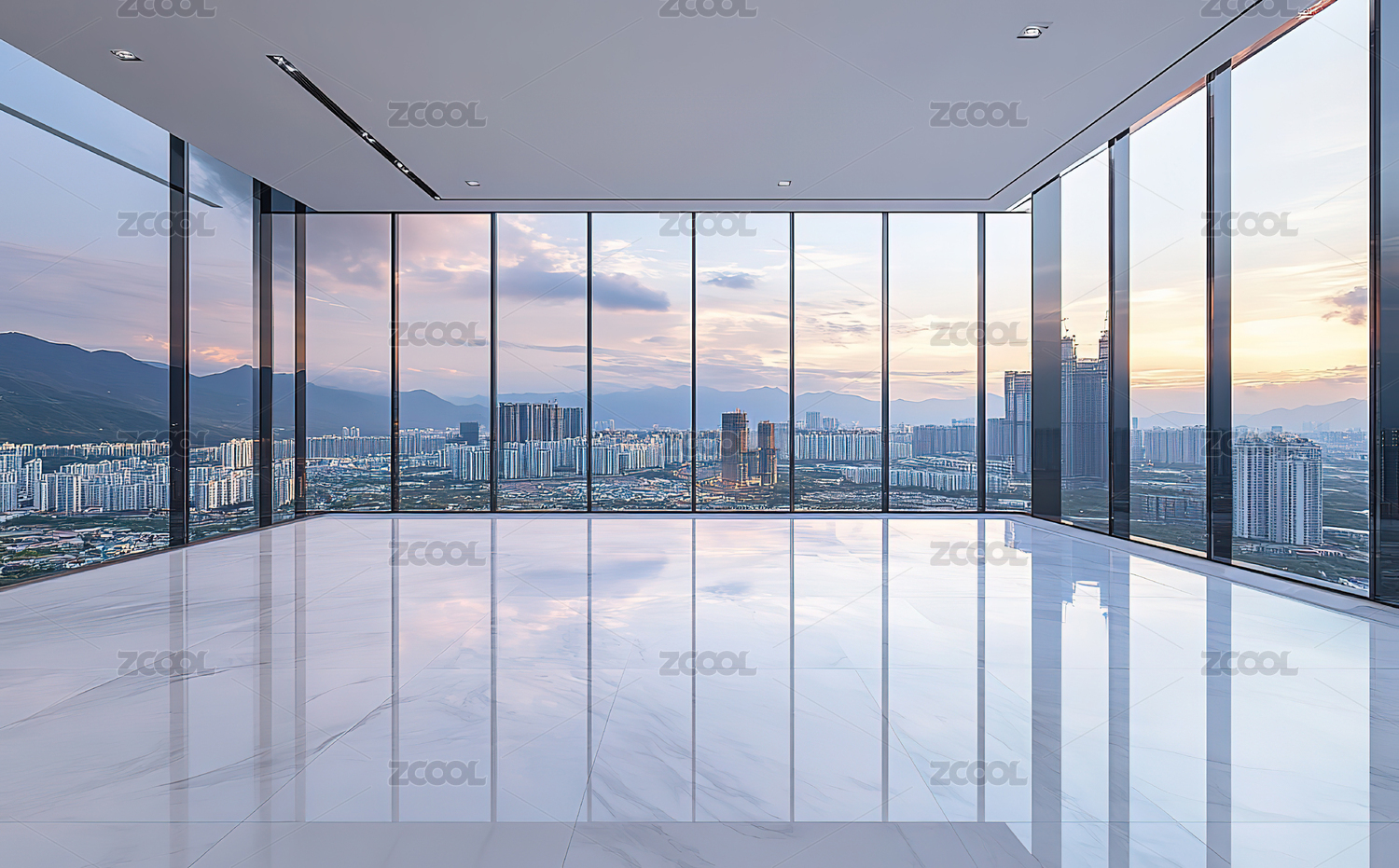 玻璃幕墙,开阔视野,简洁风格,高层建筑,内部空间,全景窗户,城市景观,大理石地板,宽敞明亮,都市天际线