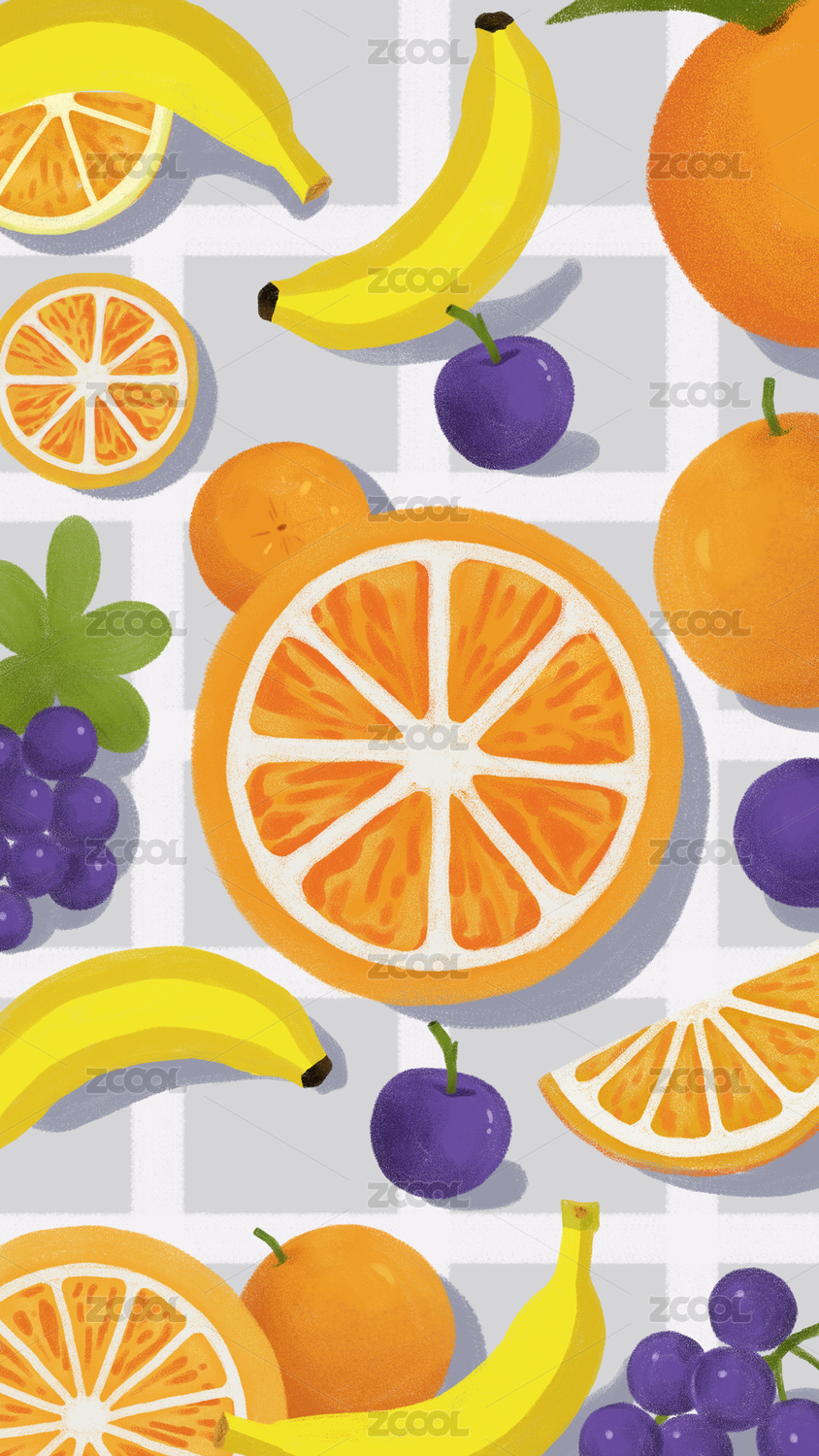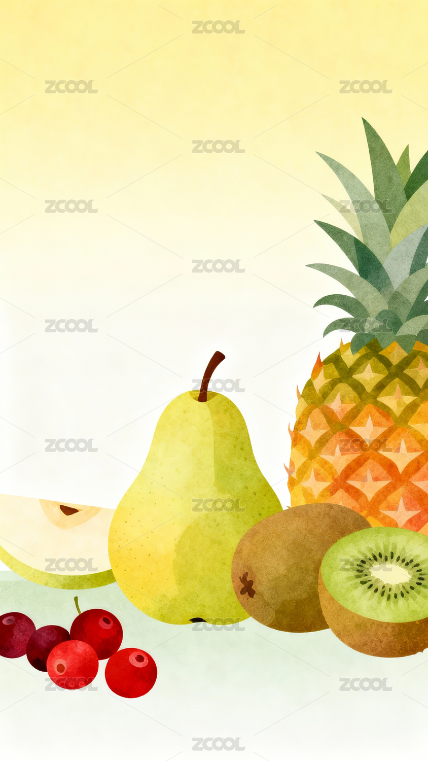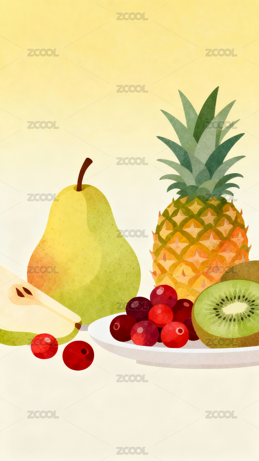 清新明亮彩色背景桌面上的水果扁平插画绘画
