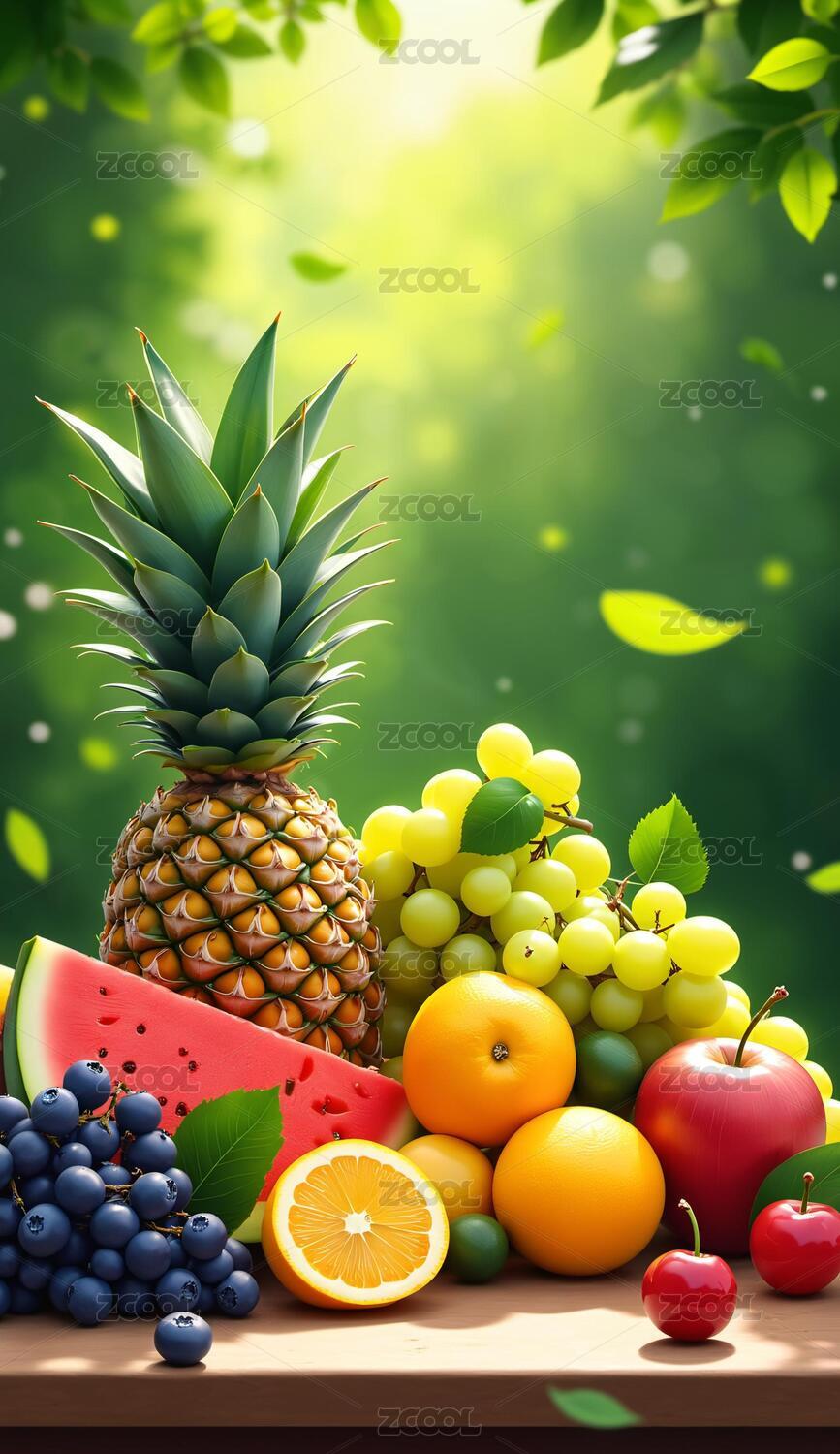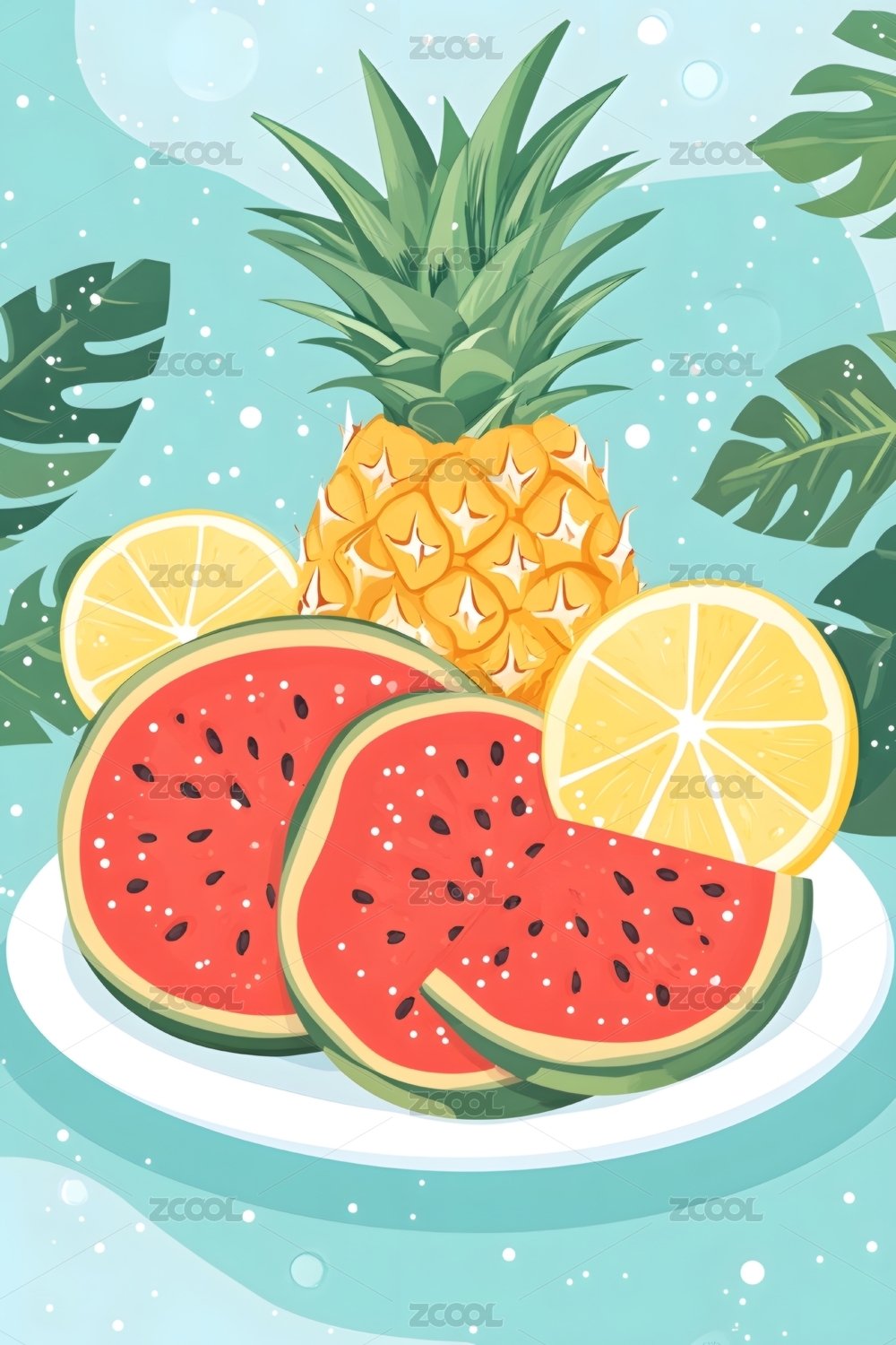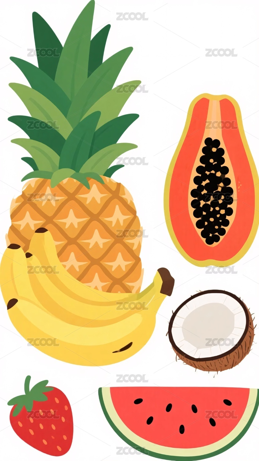 水果,香蕉,菠萝,木瓜,西瓜,草莓,椰子,插画,画面元素,主题词