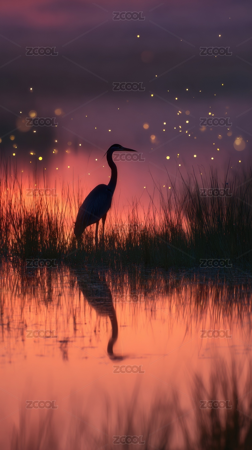 黄昏水边的鹤影